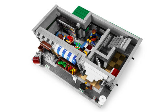 Expand your LEGO® neighborhood or start a new one with the Green Grocer! Designed in a modular style, this colorful and lively building features a grocery store and classic apartments that can be built, rebuilt and rearranged to suit your own LEGO town. Detailed architecture includes realistic interior, courtyard access, a roof terrace and fire escape, lots of windows and doors, and much more! Build a street layout by combining Green Grocer with 10190 Market Street and 10182 Café Corner! Top 3 floors lift off to reveal inner rooms! Grocery store features a blue and white awning, cash register, bins for bread, vegetables and fruit, refrigerator and tiled floor! Apartments have lots of details like bay windows, fireplace with tools, grandfather clock and windows that open to the fire escape! Stairs lead up to the apartments and to the roof terrace! Roof terrace has chairs, umbrellas, grill and flowers! Check the mailboxes for letters! Fire escape ladders move up and down! Access the courtyard behind the building! Street features lampost, fire hydrant and light fixtures! Includes 4 townspeople minifigures, plus a cat and rat! Measures 14" (35cm) high and 10" (25cm) wide!