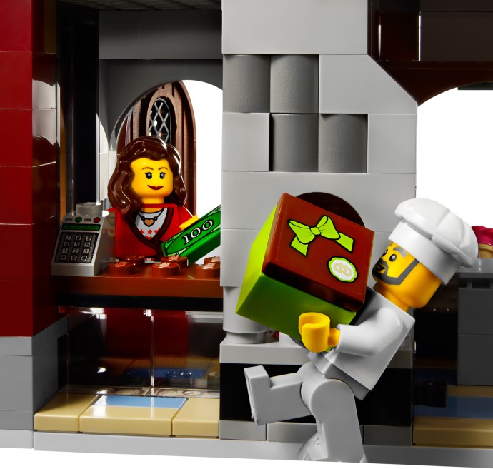 - Features LEGO Power Functions light-up brick which lights the interior of the bakery when you push it!