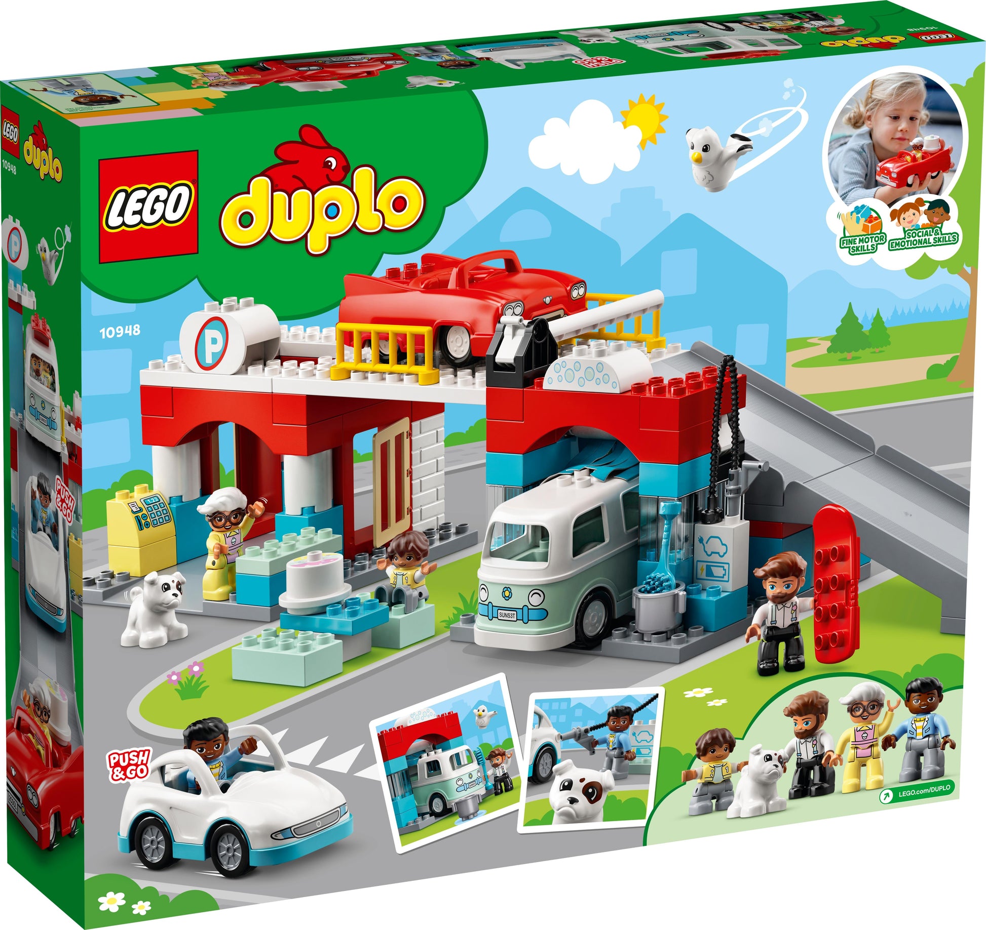 - LEGO® DUPLO® Parking Garage and Car Wash (10948) is an all-in-one car-care playset with skill-building activities, imaginative features and endless play possibilities.