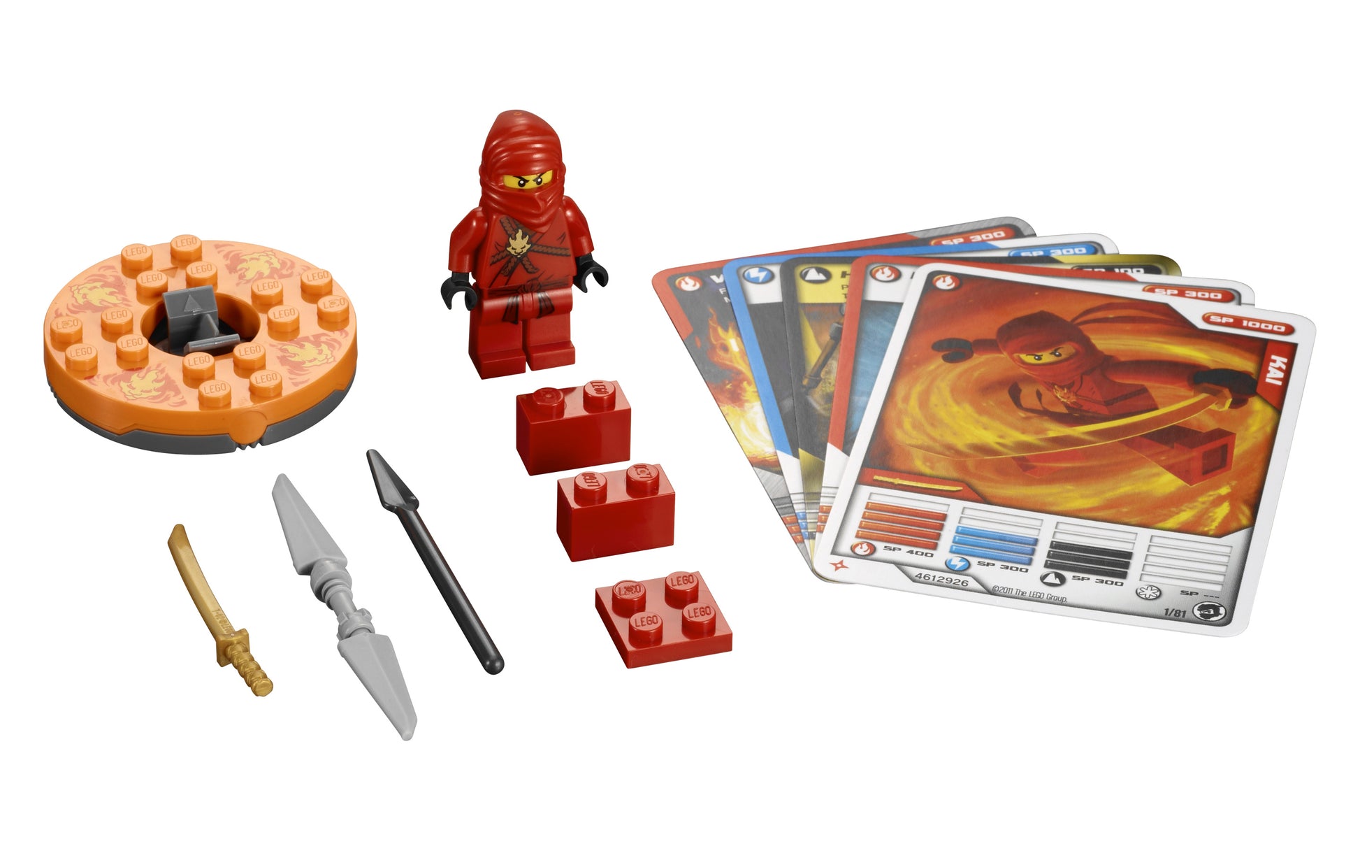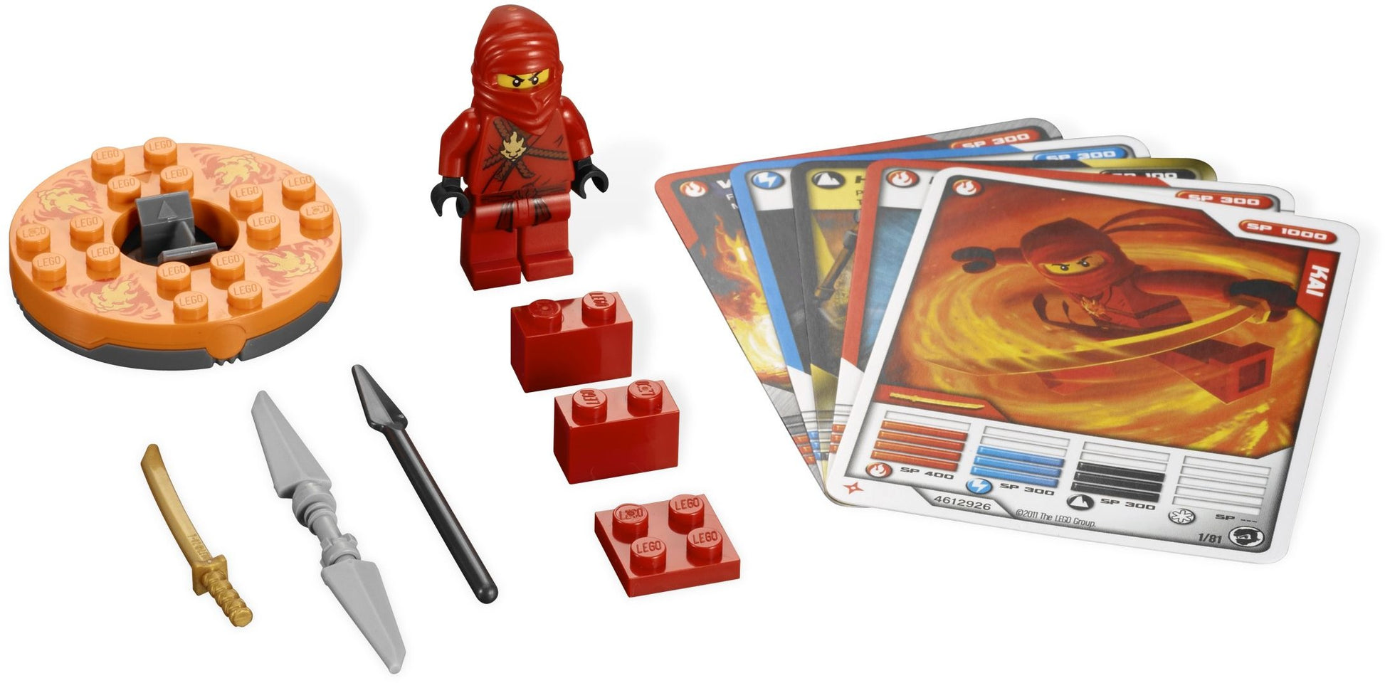 Spin your way to victory and become a Spinjitzu master! Quick to anger, even quicker to act and armed with his golden sword, Kai is ready to battle for weapons and glory! Use the 4 battle cards included in the set to influence the outcome. Set includes 1 minifigure, 1 orange fire spinner, 3 weapons, 1 character card, 4 battle cards and LEGO bricks. Includes Kai minifigure Features 1 orange fire spinner, 3 weapons, 1 character card, 4 battle cards and LEGO bricks Battle with your friends! Spin Kai on the orange fire spinner! Collect all of the Ninjago battle sets! Stands over 2 in. (5cm) tall