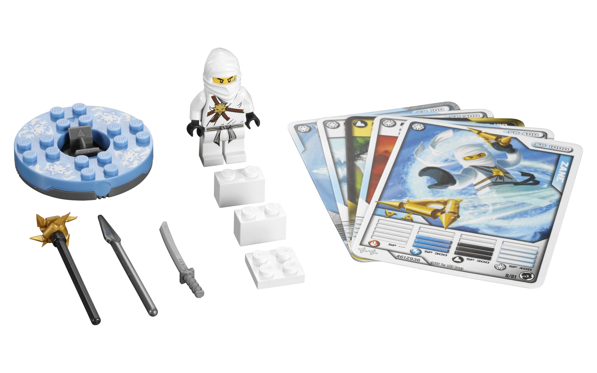 Spin your way to victory and become a Spinjitzu master! Passionate, moody, relentless and armed with the Shurikens of Ice, Zane is more than ready to battle for weapons and glory! Use the 4 battle cards included in the set to influence the outcome. Set includes 1 minifigure, 1 light blue ice spinner, 3 weapons, 1 character card, 4 battle cards and LEGO bricks. Includes Zane minifigure Features 1 light blue ice spinner, 3 weapons, 1 character card, 4 battle cards and LEGO bricks Battle with your friends! Spin Zane on the light blue ice spinner! Collect all of the Ninjago battle sets! Stands over 2' (5cm) tall