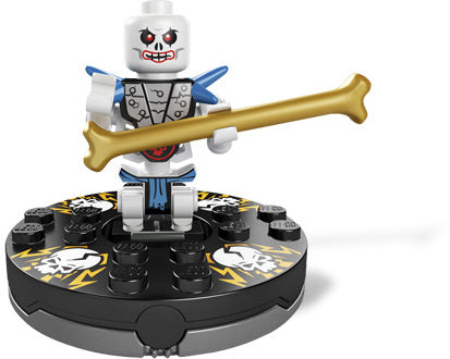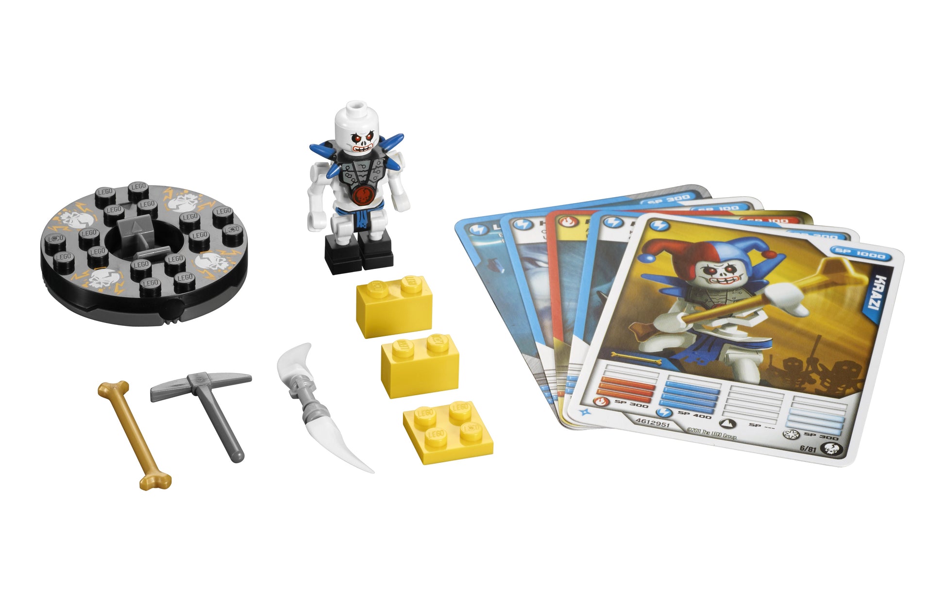 Spin your way to victory against the Spinjitzu masters! Wild and super fast, Krazi uses his lightening strike abilities to win weapons and battle for glory! Use the 4 battle cards included in the set to influence the outcome. Set includes 1 minifigure, 1 black lightening spinner, 3 weapons, 1 character card, 4 battle cards and LEGO bricks.