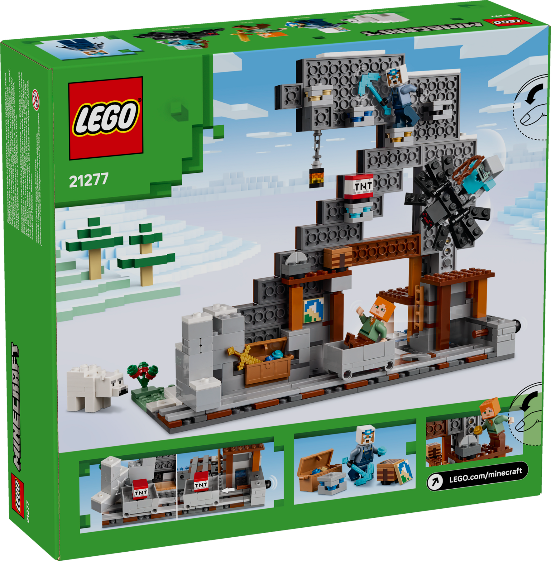 - LEGO® Minecraft® collectible figures – The set includes Alex, Miner and stray spider jockey minifigures, plus a ridable spider and a polar bear figure