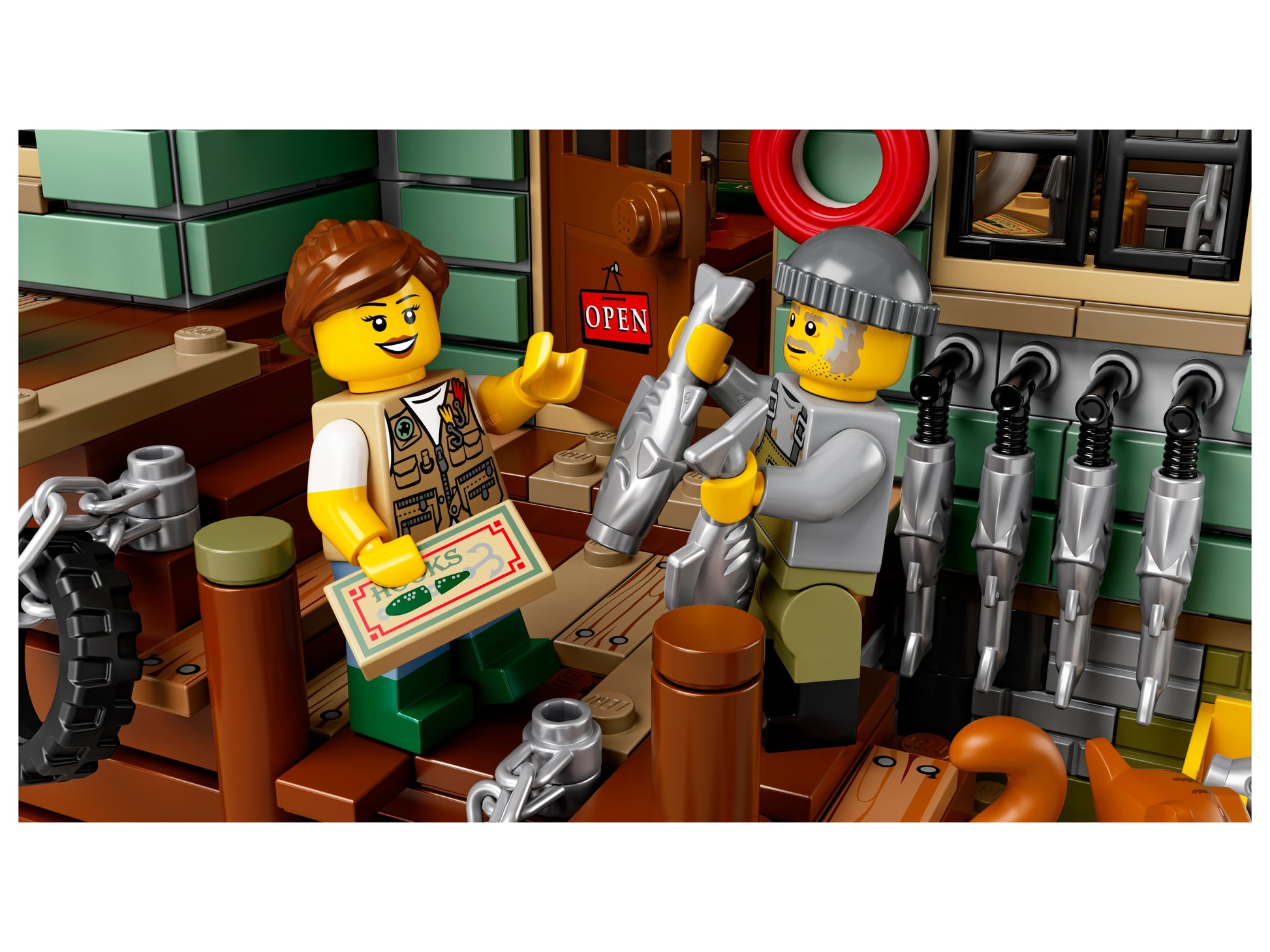 - Old Fishing Store features a detailed exterior, shop and connected lookout tower with office, all standing on a sand-colored LEGO® 32x32 baseplate with rock-style elements.