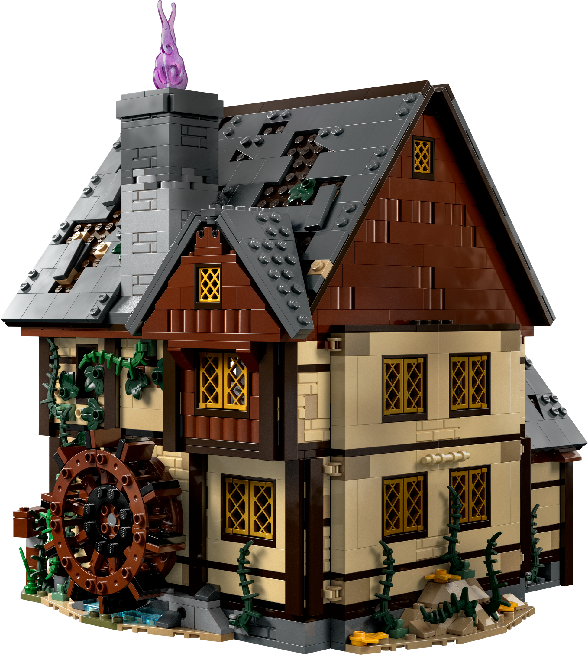 Capture the bewitching joy of a classic film with this collectible LEGO® Ideas Disney Hocus Pocus: The Sanderson Sisters’ Cottage (21341) set. The cottage can be opened in multiple ways for easy viewing of the interior details, including the museum gift shop, cauldron with a LEGO light brick to illuminate the fire underneath, Book of Spells and the witches’ bat-infested bedroom. Detach the side room where Dani Dennison was captured by the witches and turn the water wheel outside to make pink ‘smoke’ puff out of the chimney.