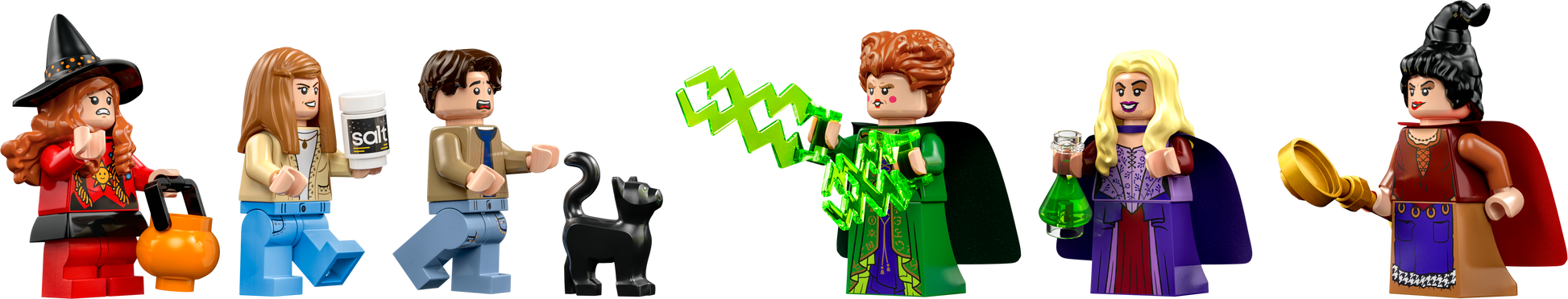- 6 LEGO® minifigures – Winifred Sanderson, Sarah Sanderson, Mary Sanderson, Max Dennison, Dani Dennison and Allison Watts, plus a Thackery Binx (in cat form) figure and accessories