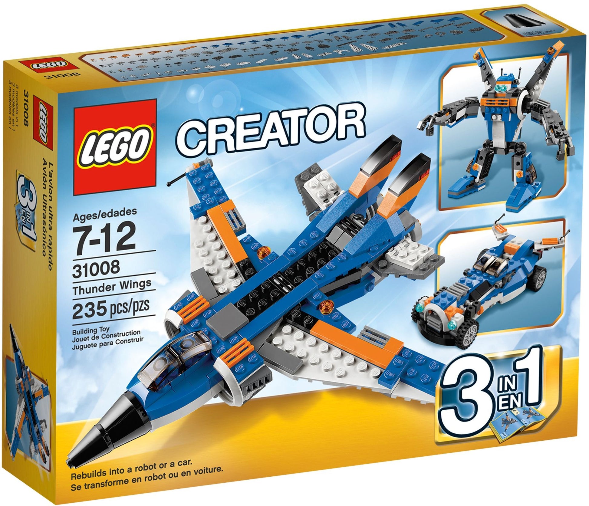 Scream through the skies with the Thunder Wings jet! Fire up the powerful afterburners as the swept-back wings and large air intakes send this super jet soaring into the clouds! Then rebuild it into a robust robot with poseable limbs or a futuristic concept car with an angled rear spoiler and real rubber tires.