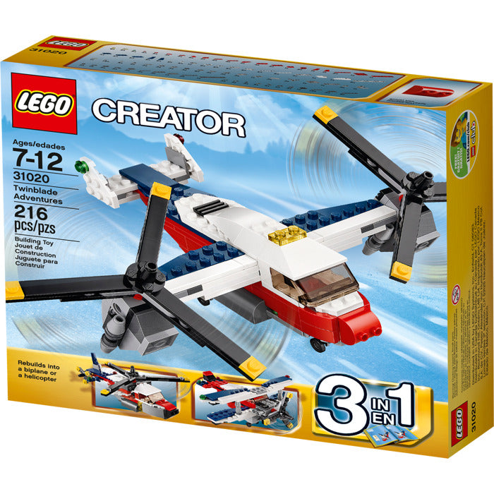 This Twinblade aircraft is literally revolutionary! Spin the rotor blades and lift off like a helicopter. Then rotate the engines 90 degrees and power forwards like an airplane while the dual tail fin ensures steady flight. With its red and white coloring and engine exhaust details, the Twinblade is easy to spot high in the sky. Back on the ground, use the ramp to access the cargo hold, and when you want a new challenge, rebuild it into an old-fashioned biplane or a speedy helicopter.