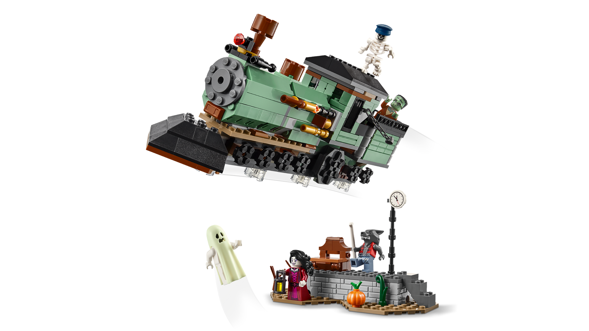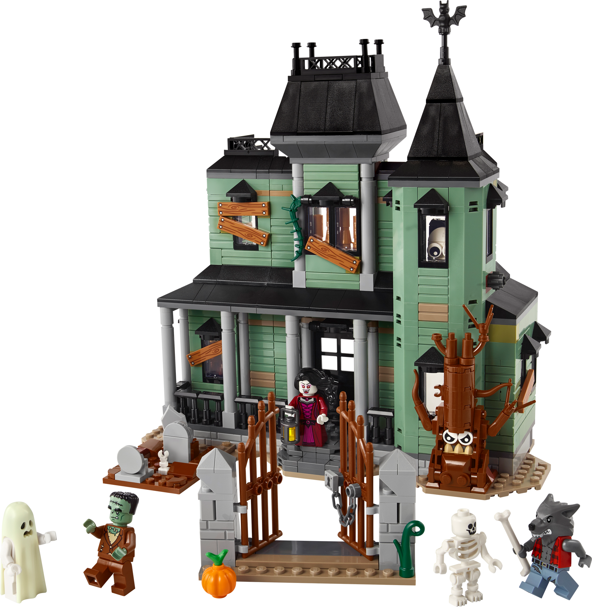 - 5 minifigures – LEGO® building set comes with 5 scary characters: werewolf, vampire, ghost with a glow-in-the-dark cape, Frankenstein’s monster and a skeleton, each with an accessory