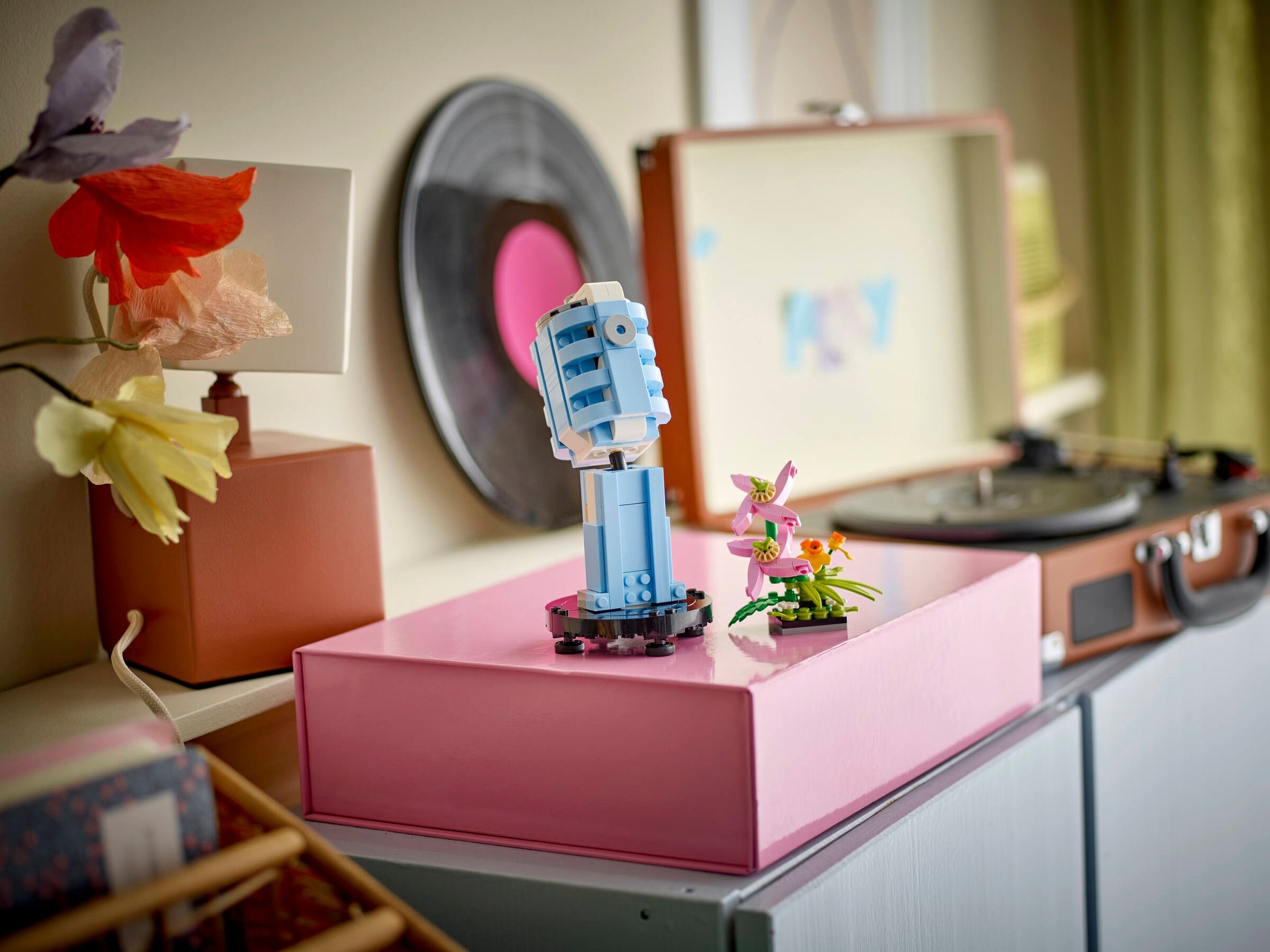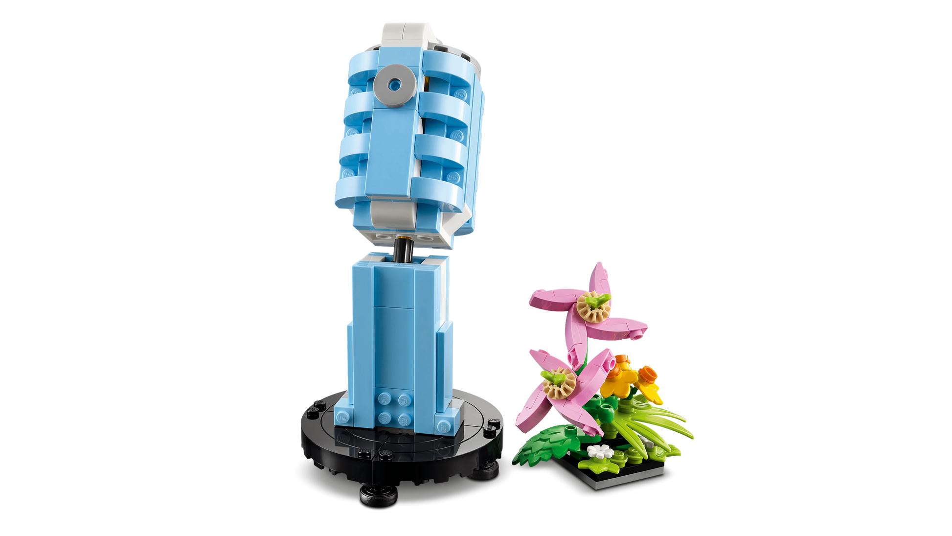 LEGO fans have the choice of 3 different music set building options: a record player with flowers; a retro-style radio toy with moving buttons, an adjustable aerial and removable flowers; or a rotating classic microphon e with a stand of flowers. Each model can be used for fun role play or as an attractive home decor display item.