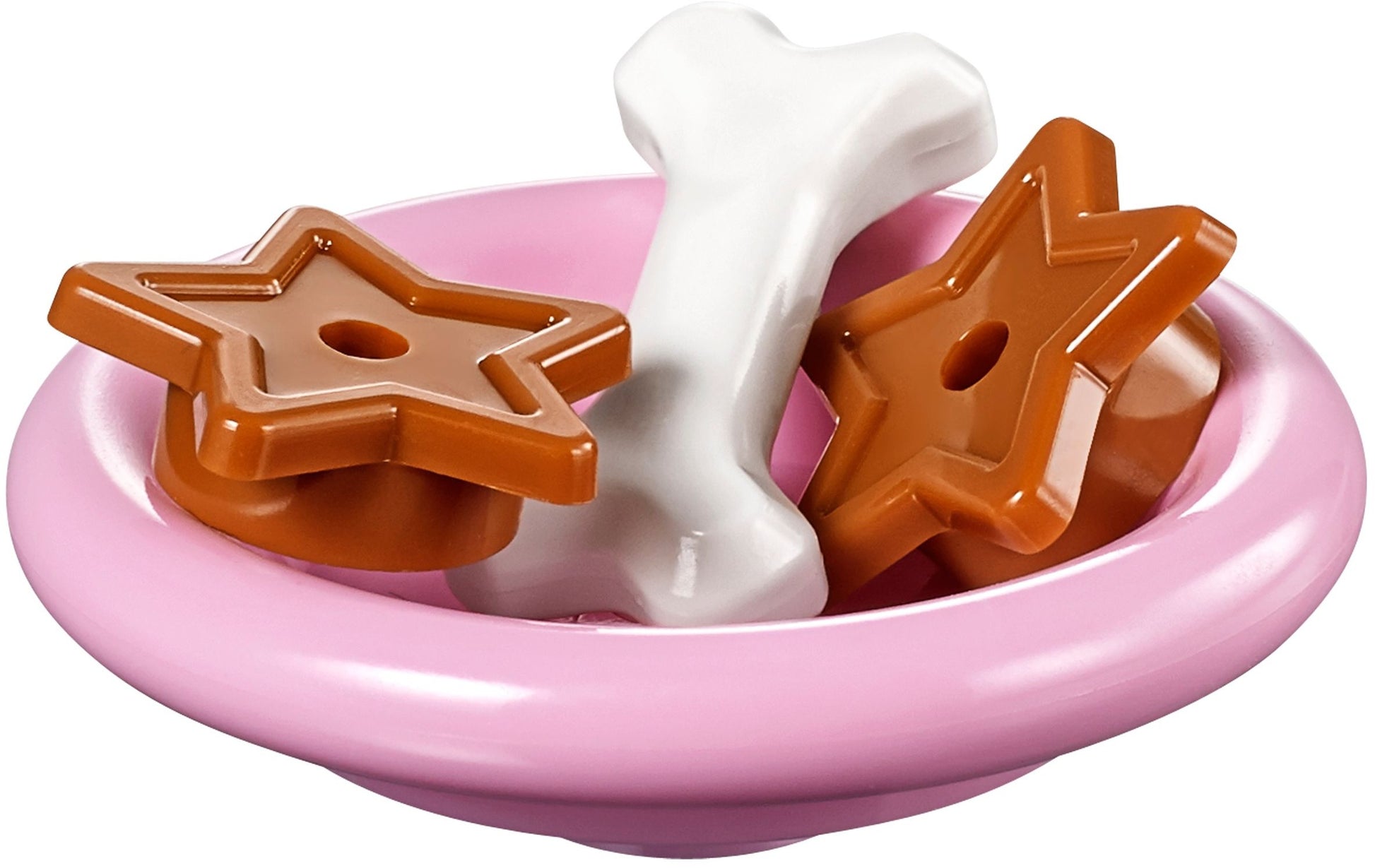 Take the little puppy to agility training! Help the puppy practice weaving in and out of the cones and running up the seesaw, waiting for it to tip before running down the other side. Then give her a long run up and watch her leap over the water jump with ease. Throw the stick and when she brings it back, fill up her water bowl for a good drink and give her a treat. After all that hard work, puppy deserves a lie down in her comfy bed. Combine with the 41085 Vet Clinic to make a great clinic garden. Includes a puppy.