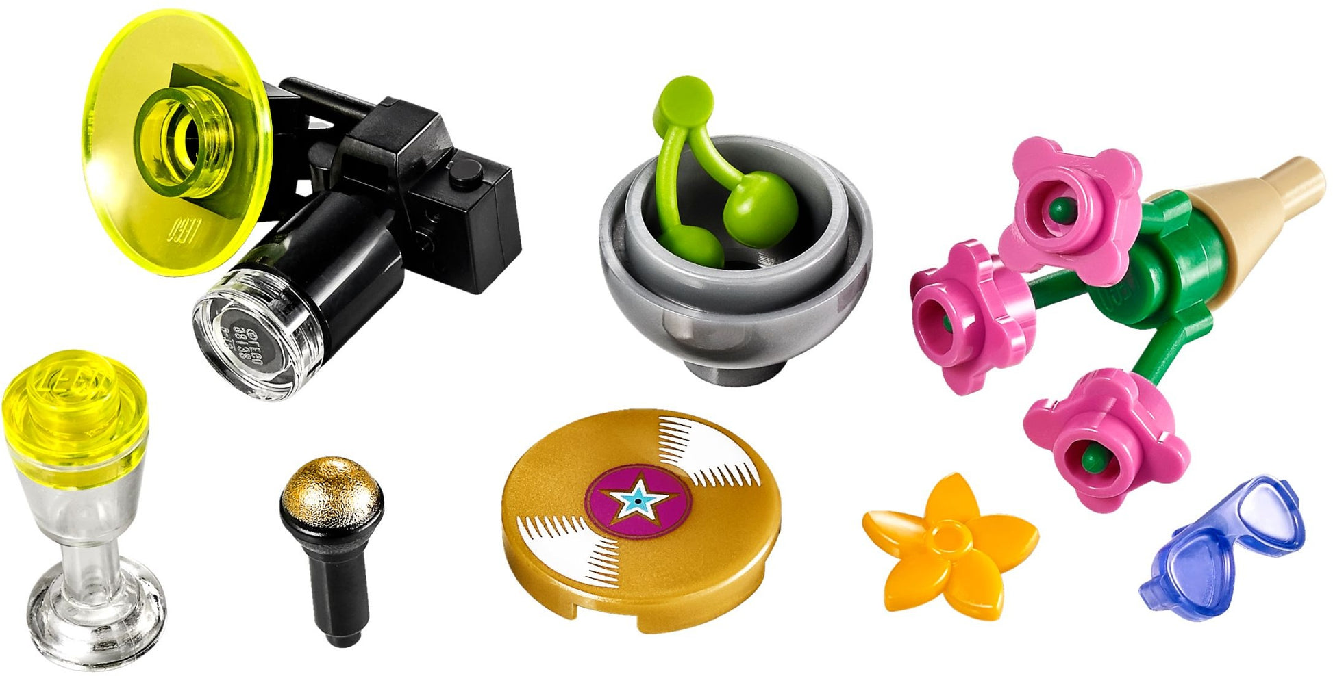 - Accessory elements include a professional camera, microphone, CD, 2 glasses, fruit bowl, cherries, sunglasses, hair decoration, show announcement board and a bag