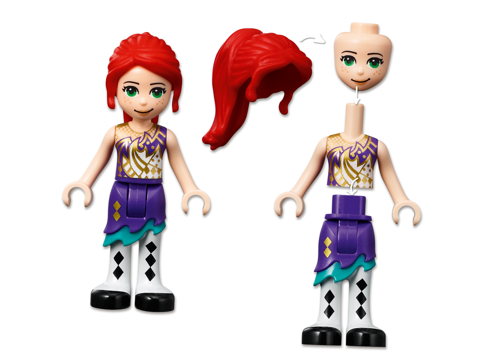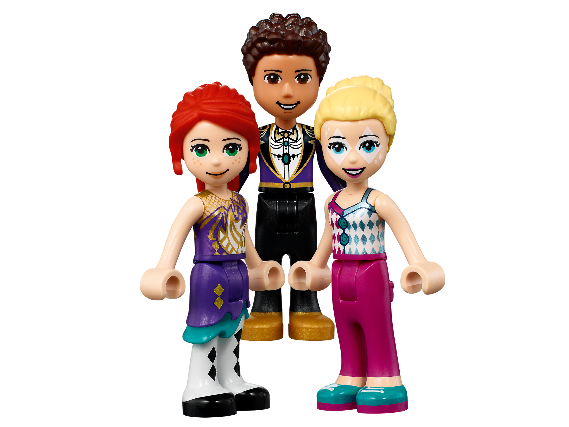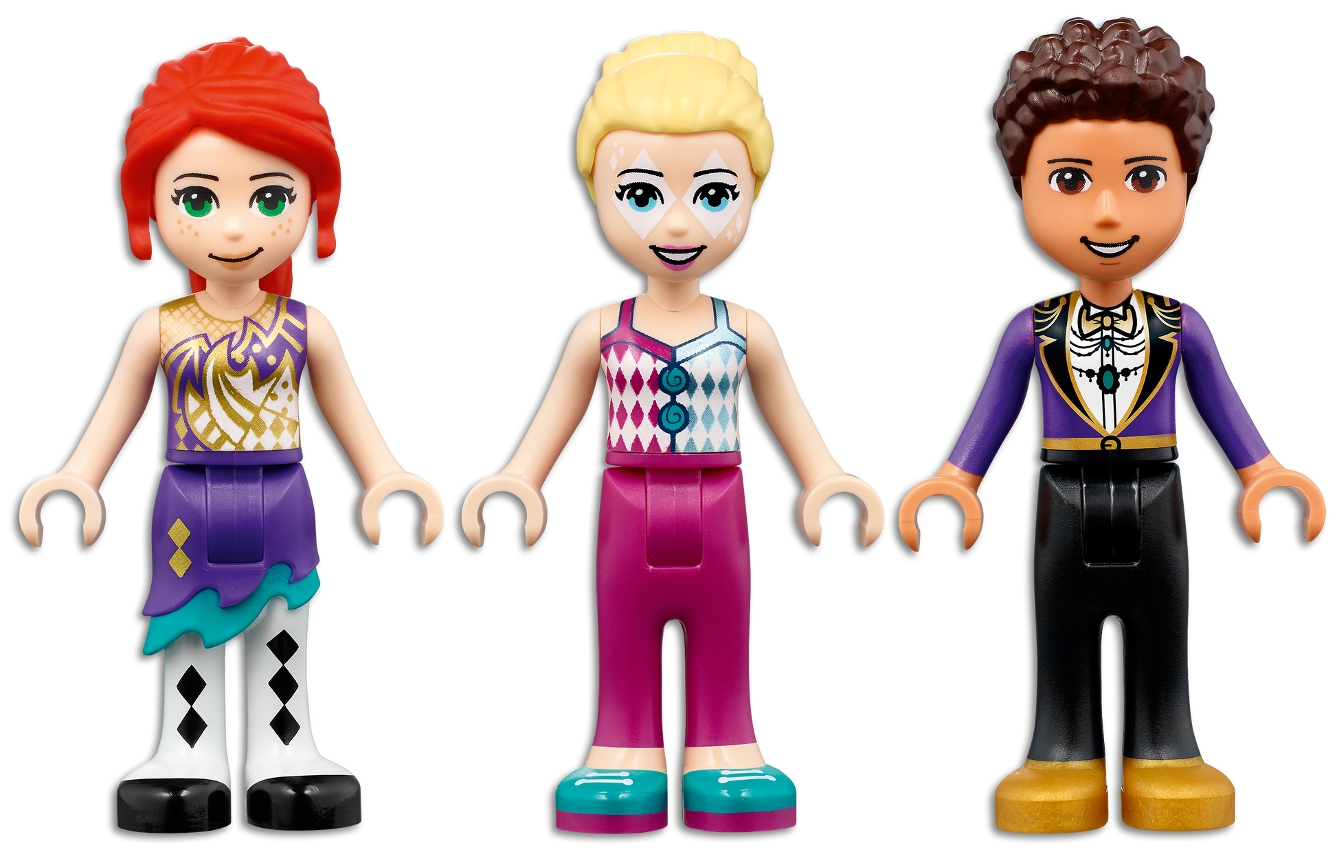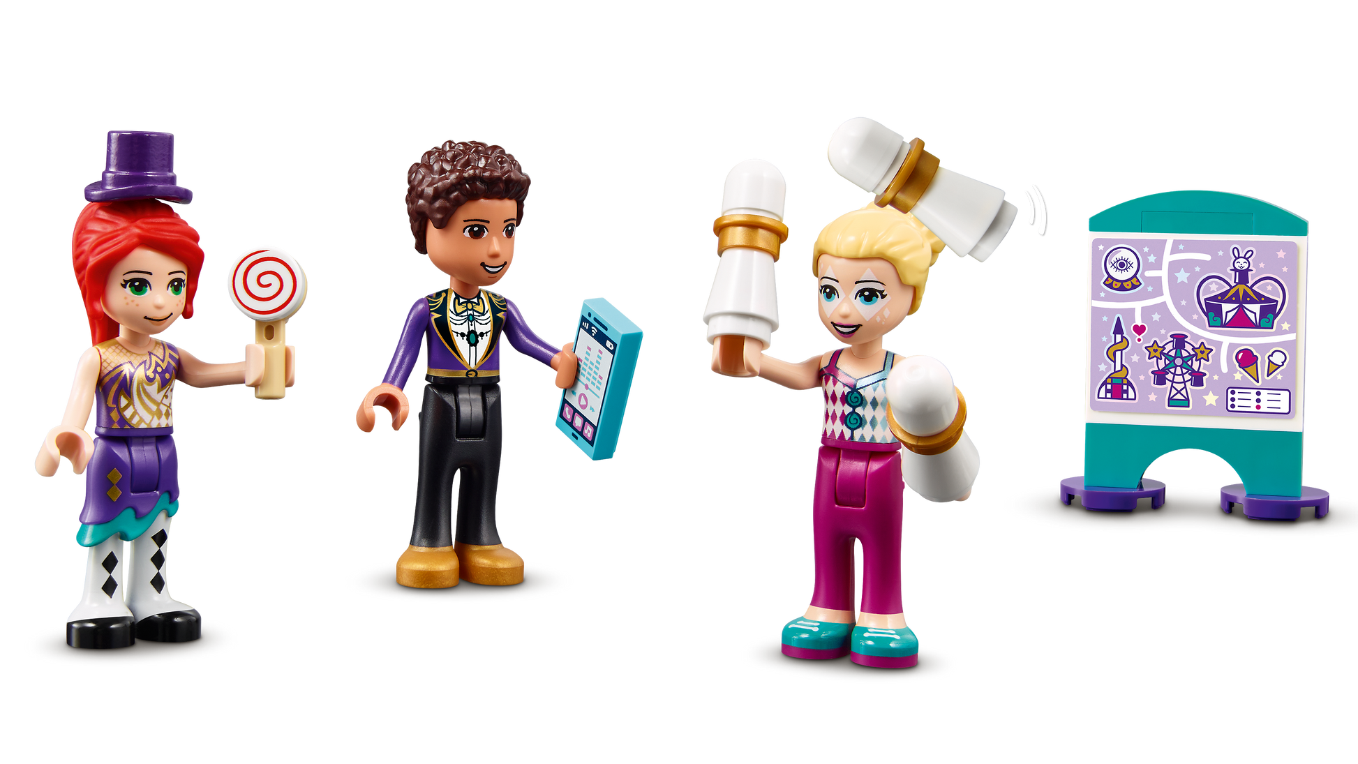 - This carnival set comes with 3 LEGO® Friends mini-dolls dressed up in fair clothes and face paints. It also has creative carnival kit such as juggling clubs, a lollipop, top hat and a fairground map.