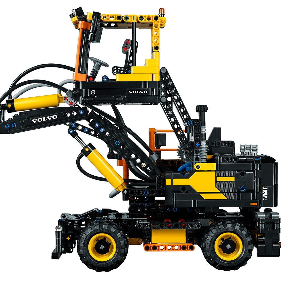 Enjoy a rewarding building experience with this awesome 2-in-1 LEGO® Technic model. Developed in partnership with Volvo Construction Equipment, this meticulously detailed replica of the Volvo EW160E, with its classic yellow and black color scheme, has all the features of the real-life wheeled excavator. Operate the versatile pneumatic boom and grabbing bucket, rotate the massive superstructure and elevate the cab for optimal visibility. If you need extra stability, extend and secure the outriggers, lower the front blade and lift the entire structure into the air! The authenticity of this model is without bounds, right down to the detailed cab with seat, armrests, sun visor and adjustable mirrors. Upgrade with the LEGO Power Functions 8293 motor set (not supplied) and you have a fully motorized boom and working lights! When you feel like another building challenge, rebuild it into the heavy-duty Volvo L30G compact material handler.