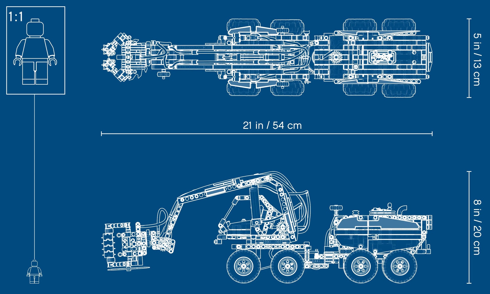 - Forest Machine with boom retracted measures over 7” (18cm) high, 13” (35cm) long and 5” (13cm) wide.