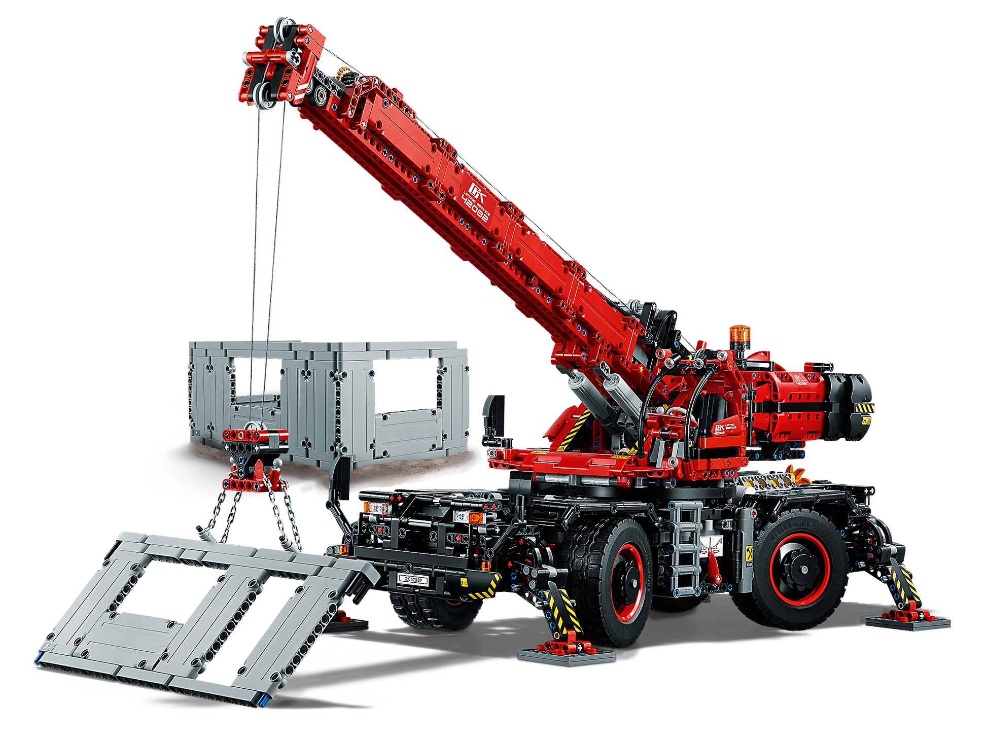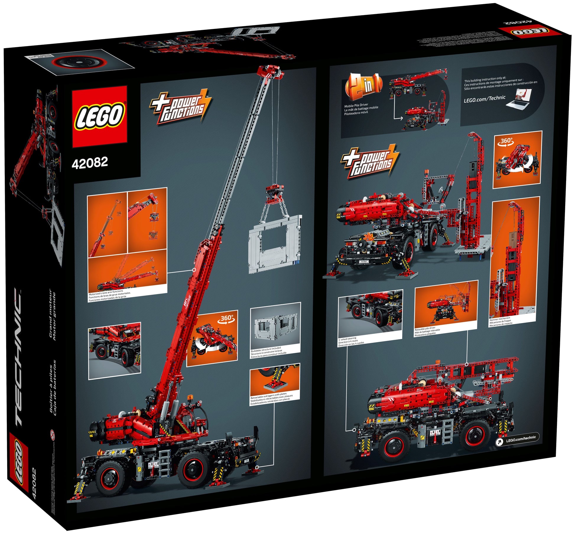 Enjoy an immense build and play experience with the LEGO® Technic™ 42082 Rough Terrain Crane, our largest and tallest LEGO Technic crane to date, pre-August 2018. Activate the Power Functions and select upper or lower crane mode for complete control over an array of easy-to-operate, motorized functions. Lower the stabilizer legs, rotate the superstructure through 360°, operate the lifting winch or send the extendable boom a meter into the air. Manual functions include 4-wheel steering, 4-wheel drive, detailed V8 engine with moving pistons and fan, and adjustable wing mirrors, plus a detailed operator’s cab with an opening door. This amazing model also includes 2 opening compartments with tools, chains and a fire extinguisher, plus 4 outrigger landing plates and 4 LEGO Technic building sections that can be lifted and assembled. This 2-in-1 LEGO Technic set comes with a red and black color scheme and can be rebuilt to create a Mobile Pile Driver.
