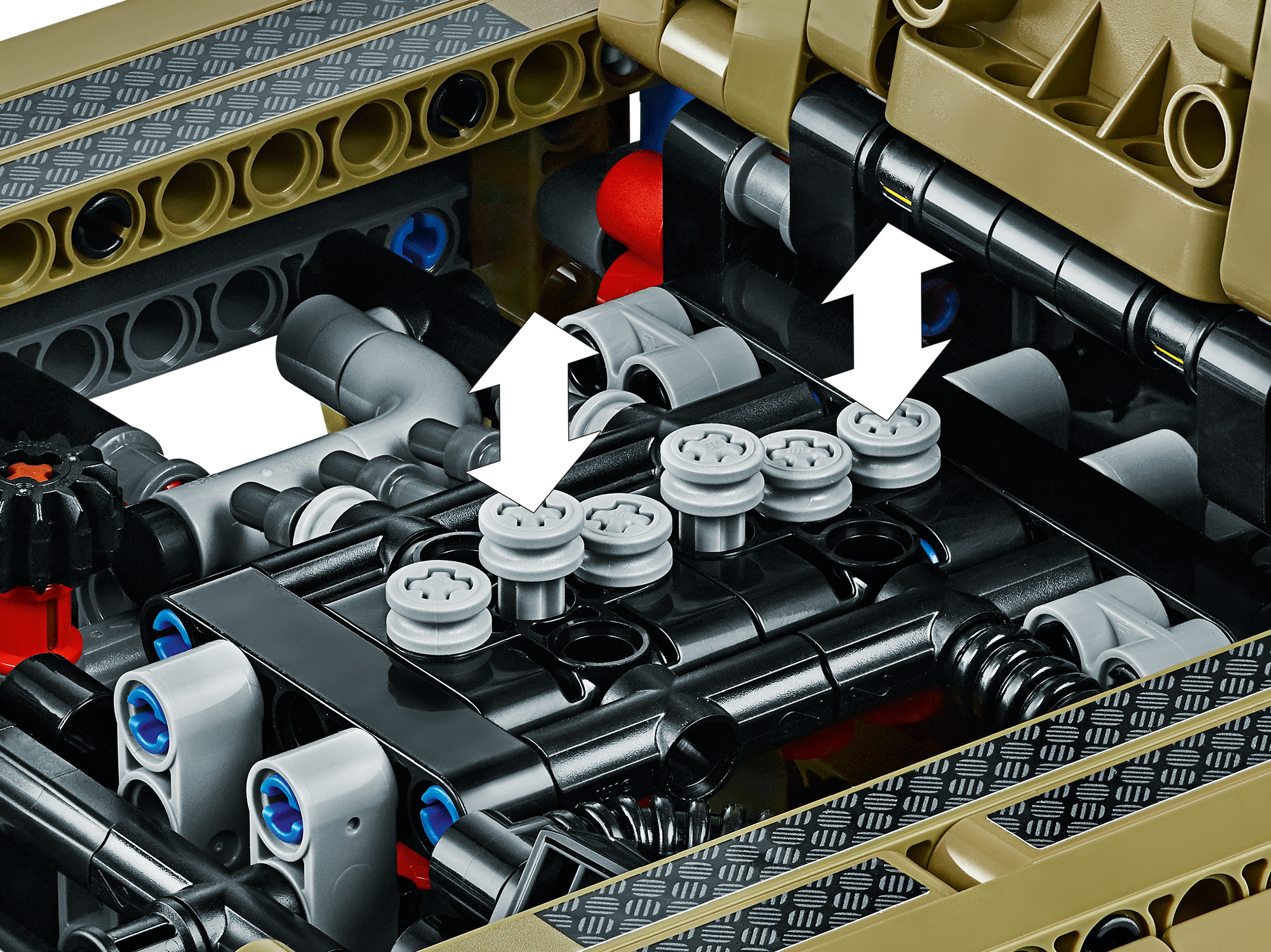 - New-for-October-2019 transmission system with 2 levers for engaging high or low gear ratios and a selector for changing gear – the most sophisticated LEGO® Technic™ gearbox to date!