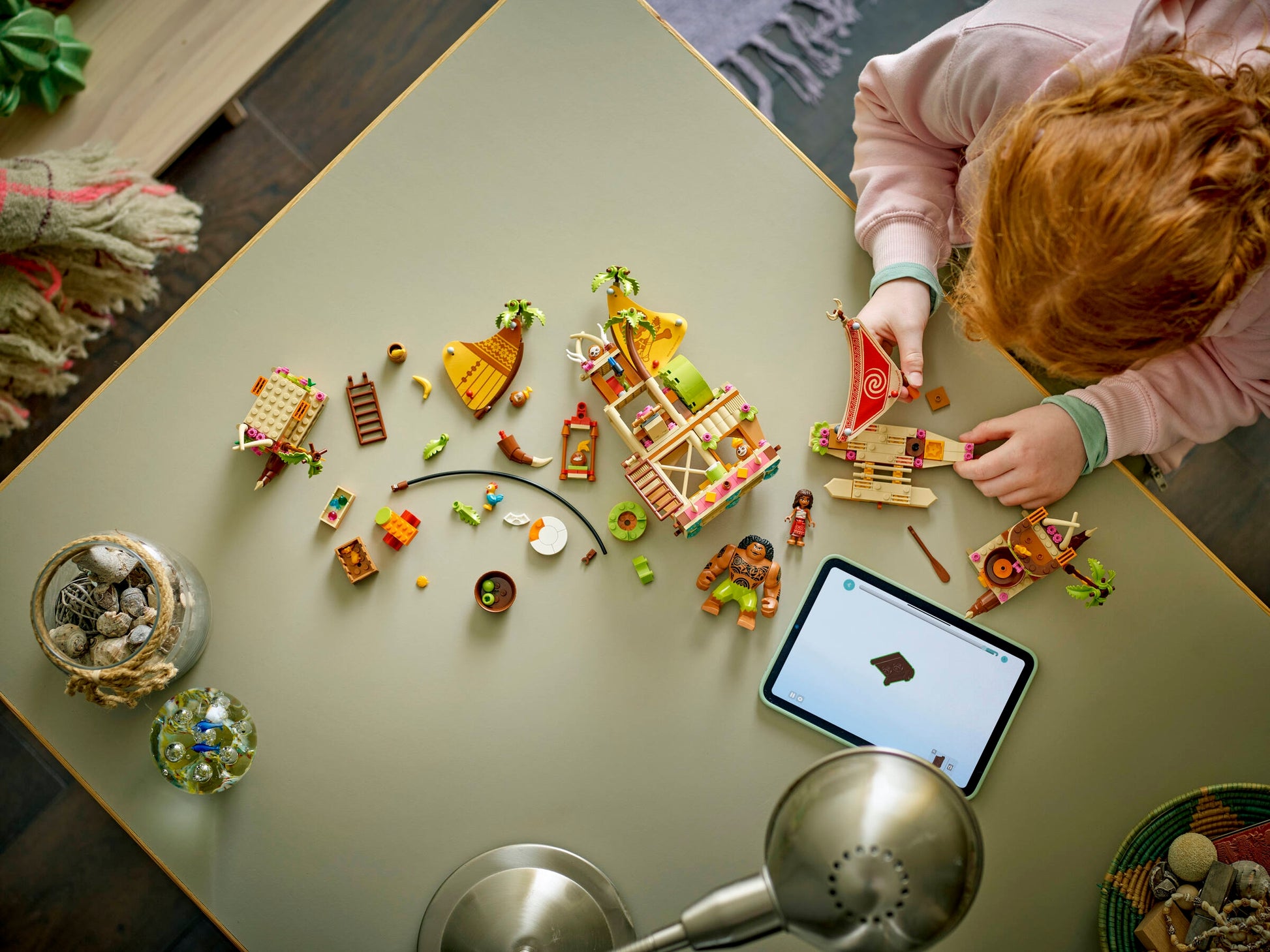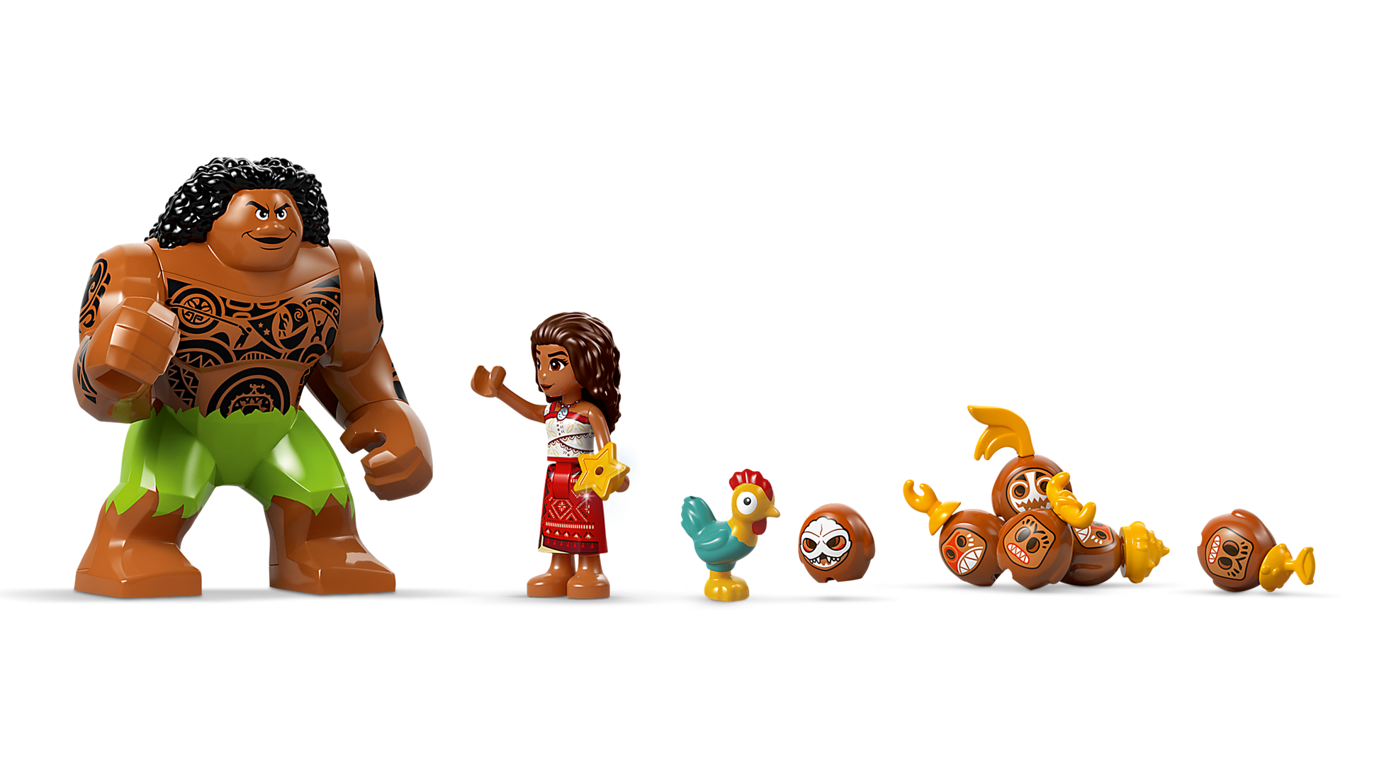 - Moana boat building set – Includes a barge boat with 3sections and a zipline, a smaller, 2-hulled canoe with storage space, Heihei the chicken, Moana, Maui, Kotu and 5 more LEGO® ǀ Disney characters