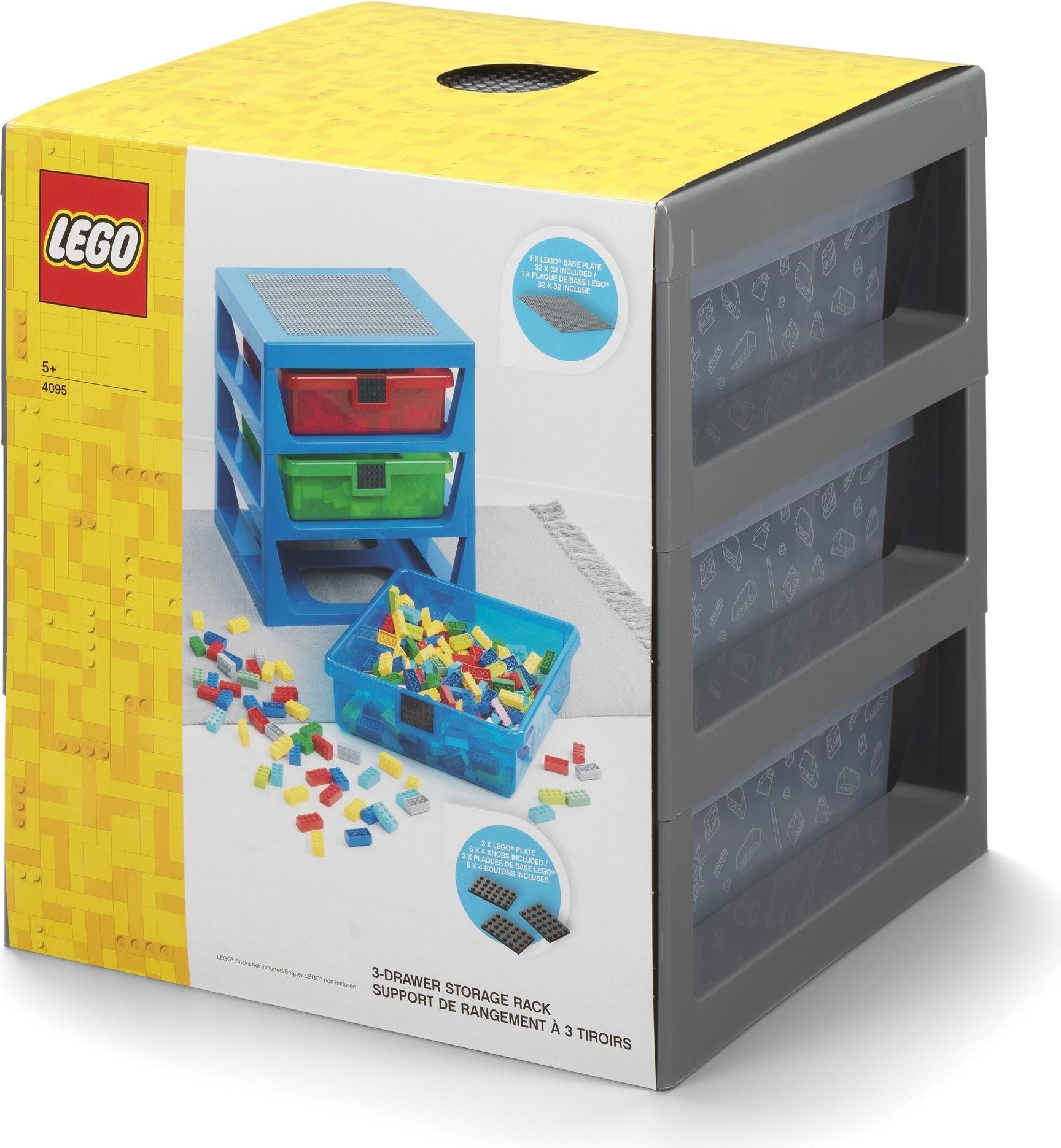 - Practical and stylish LEGO® 3-Drawer Storage Rack in gray, featuring semitransparent, removable drawers for storing bricks and a 32x32 LEGO baseplate on top to build and display LEGO models.