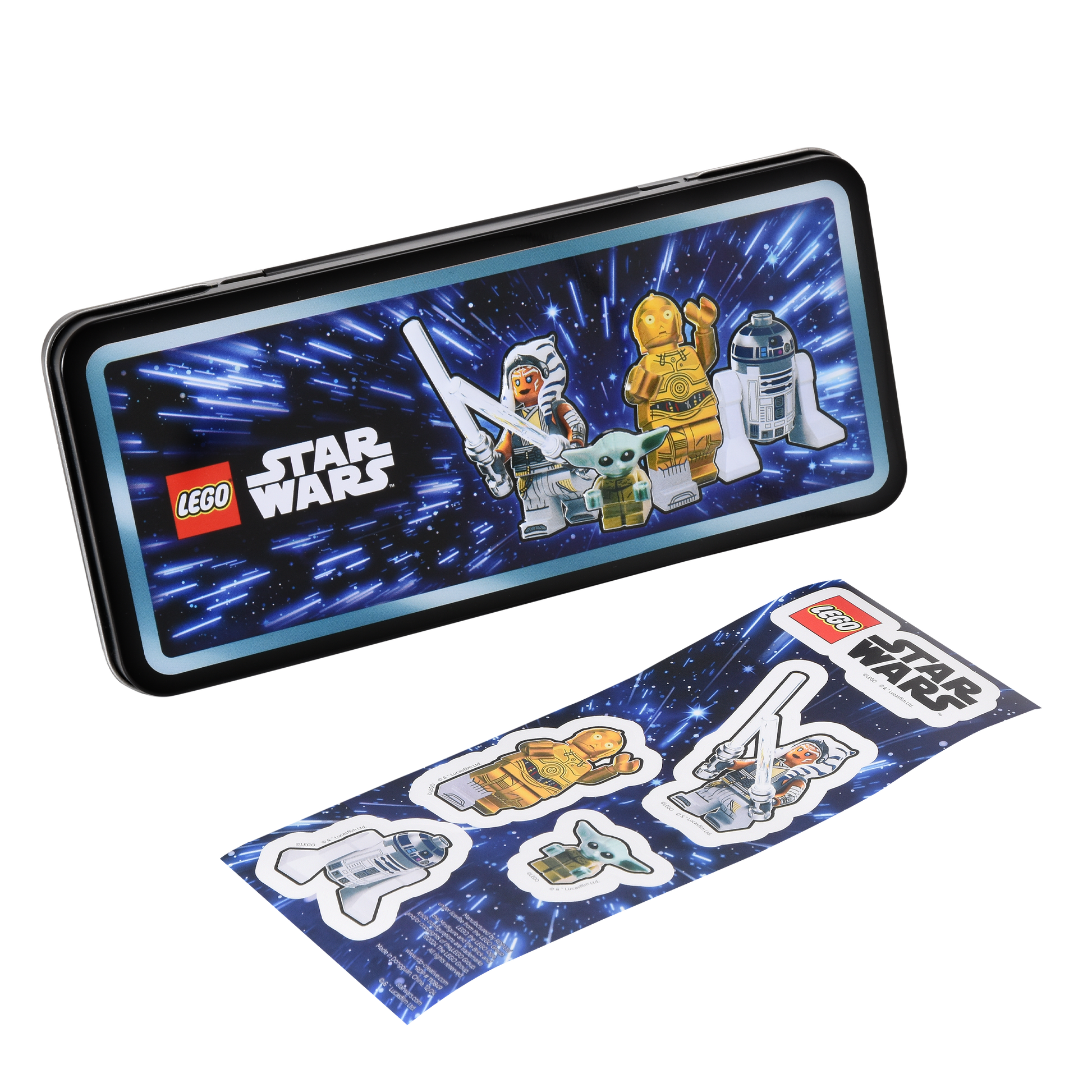 - Stationery organizer for kids – Stow pencils in this metal LEGO® Star Wars™ Pencil Box, featuring illustrations of Ahsoka Tano, Grogu, C-3PO and R2-D2 LEGO minifigures on the lid