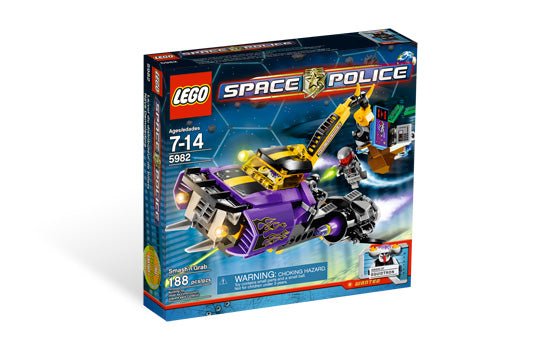 Priority one to all Space Police units in Galaxy City! Squidtron has just smashed into the Space Bank and stolen an asteroid ATM -- asteroid and all! It's up to the Space Police commando to stop the space-crook before he gets away in his custom ram-raider vehicle, complete with dual firing plasma cannons, a spiked ramming grill and a heavy lifting crane for escaping with the loot! Set includes 2 minifigures: Commando and Rench alien Ram-raider armed with twin shooting plasma cannons, spiked ramming grill and lifting crane Measures over 7" (17cm) long and over 4" (10cm) wide