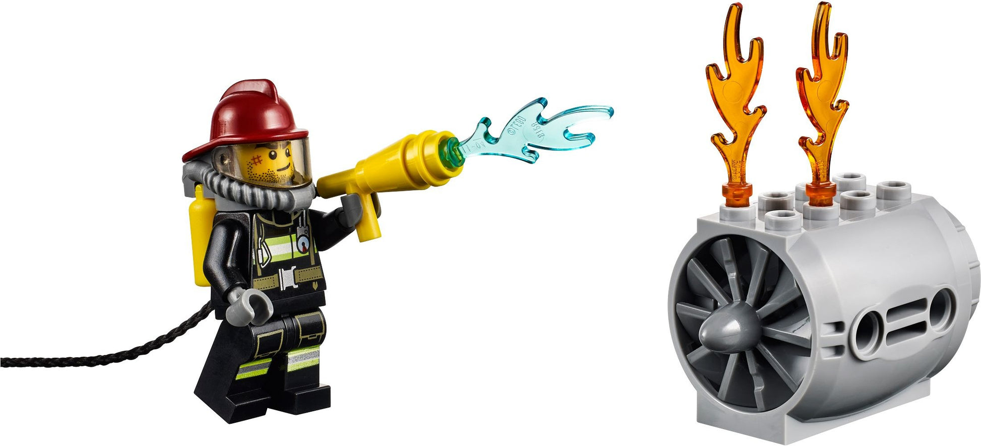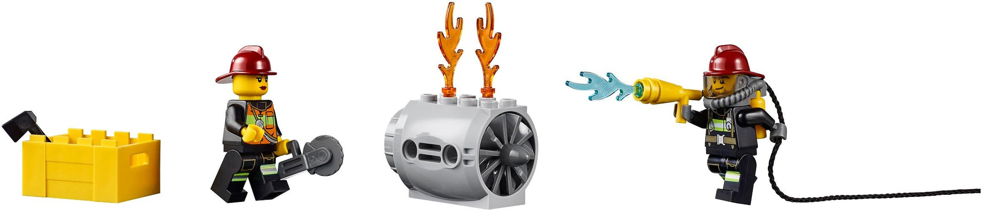 The jet engine is on fire and must be put out, fast! Speed to the scene in the Airport Fire Truck, point the water cannon at the blaze and douse it with a blast of water. If that doesn’t do it, reel out the side-mounted fire hose and help the firefighter direct even more water onto the flames. No fire is too big for the amazing Airport Fire Truck! Collect this and all the other vehicles in the Great Vehicles range! Includes 2 firefighter minifigures with assorted accessories.