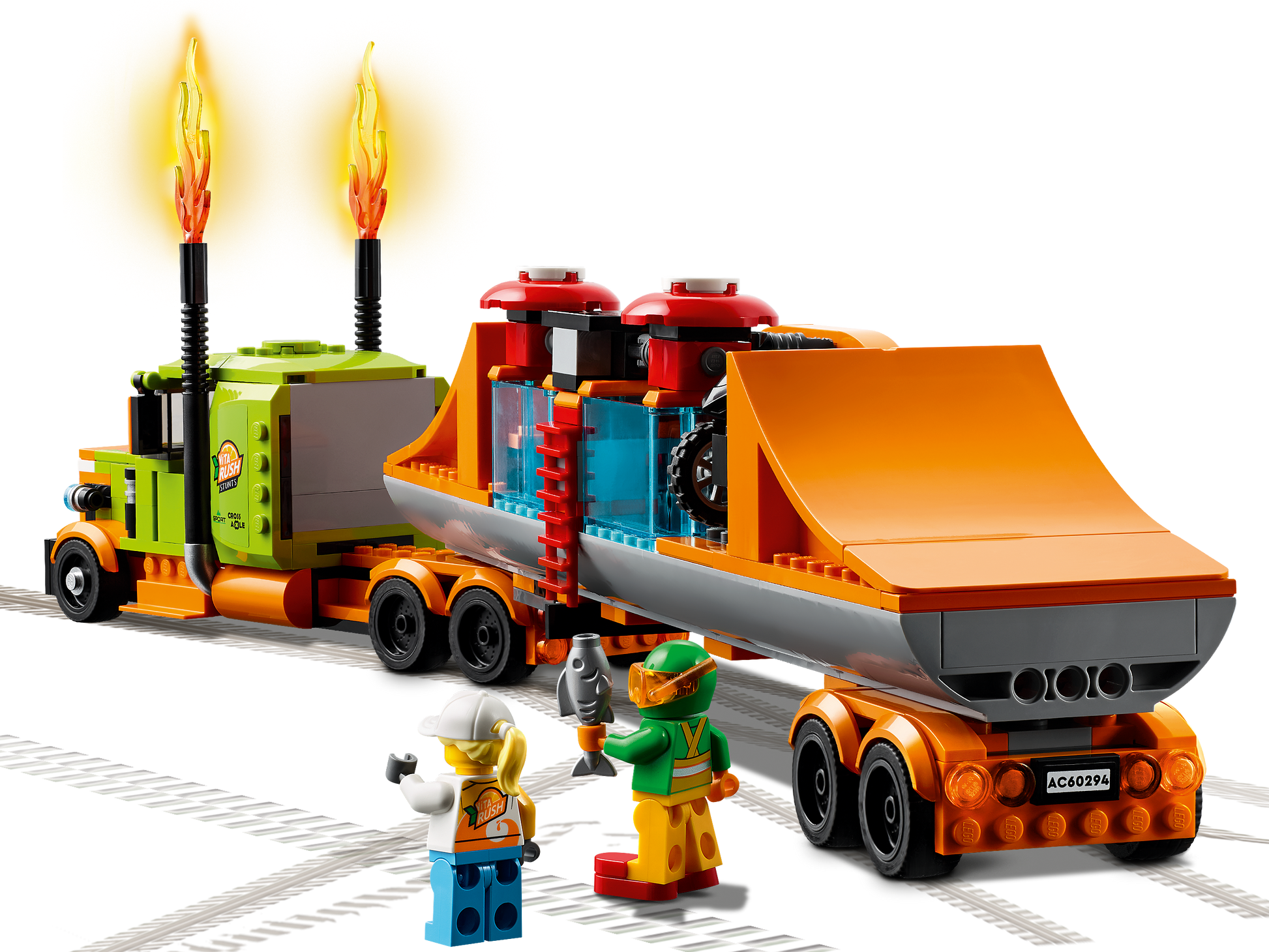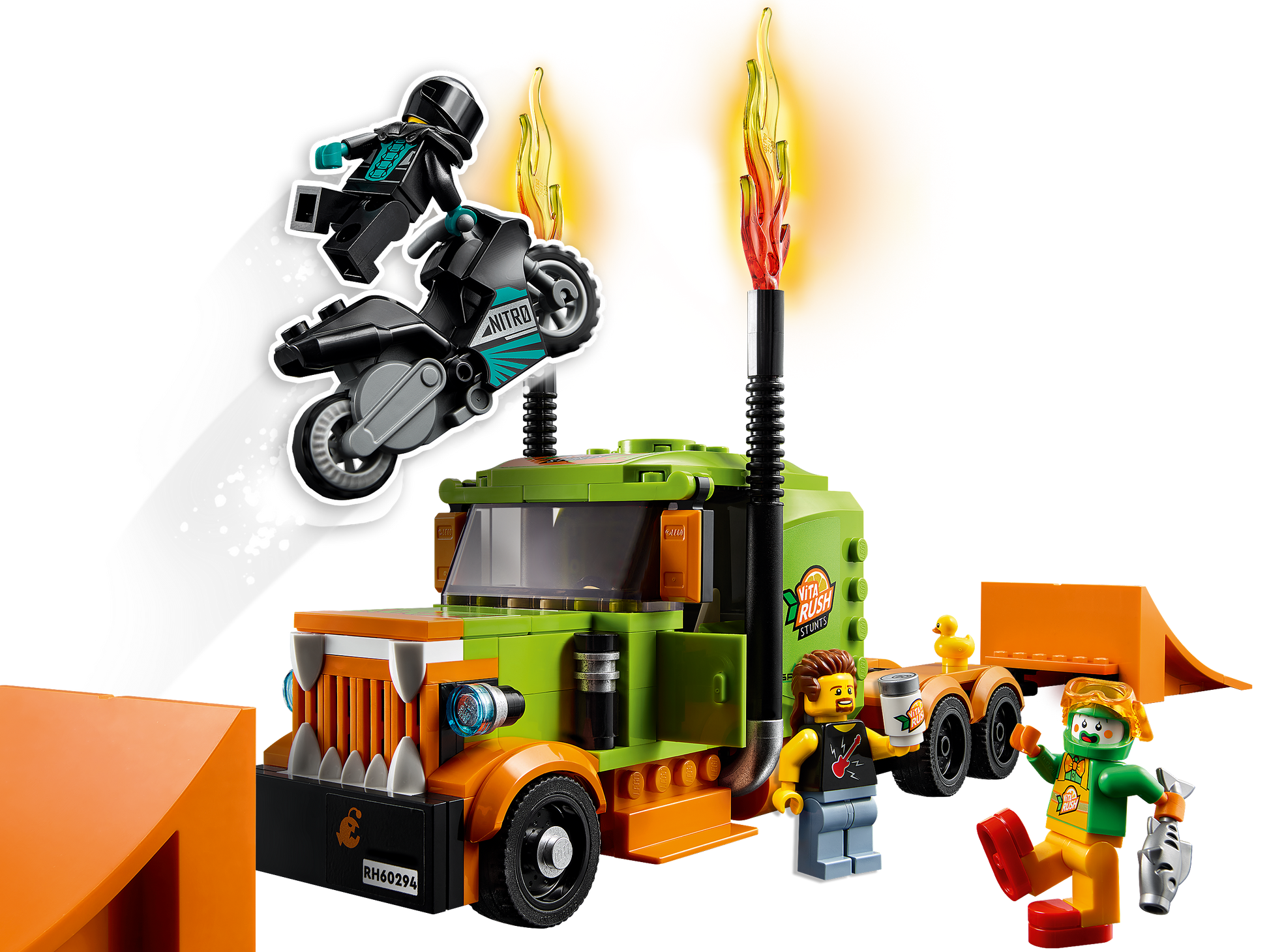 - Set the scene for action-packed play with this premium-quality LEGO® City Stunt Show Truck (60294) toy playset, including a flywheel-powered stunt bike and fun props for performing spectacular stunts.