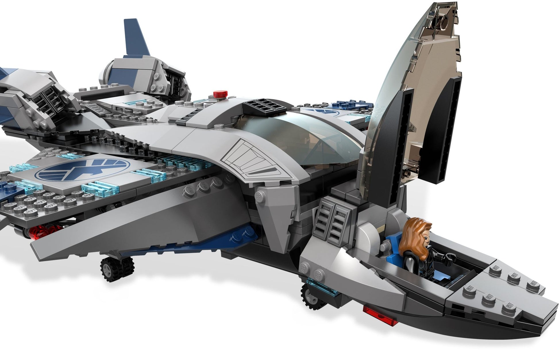 • Quinjet features adjustable wing tips, 2 opening cockpits with space for 2 minifigures, detachable mini-jet, 4 missiles, prison pod and rear door