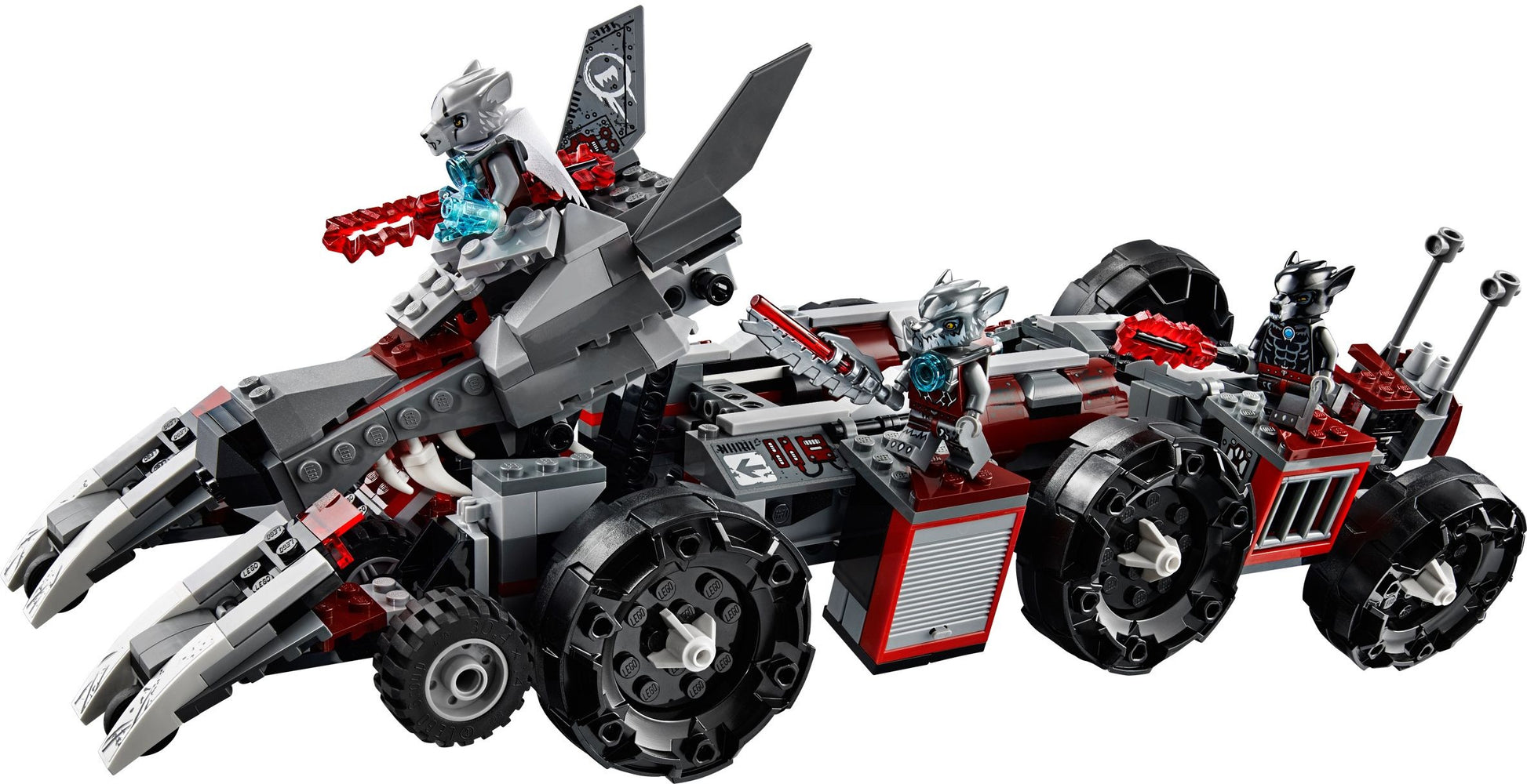 • Features cool articulated wolf face, teeth, ears and claws, 6 big all-terrain wheels, CHI, mobile prison and 5 detachable vehicles: a wolf helicopter, 2 wolf claw bikes, wolf motorcycle and a wolf truck