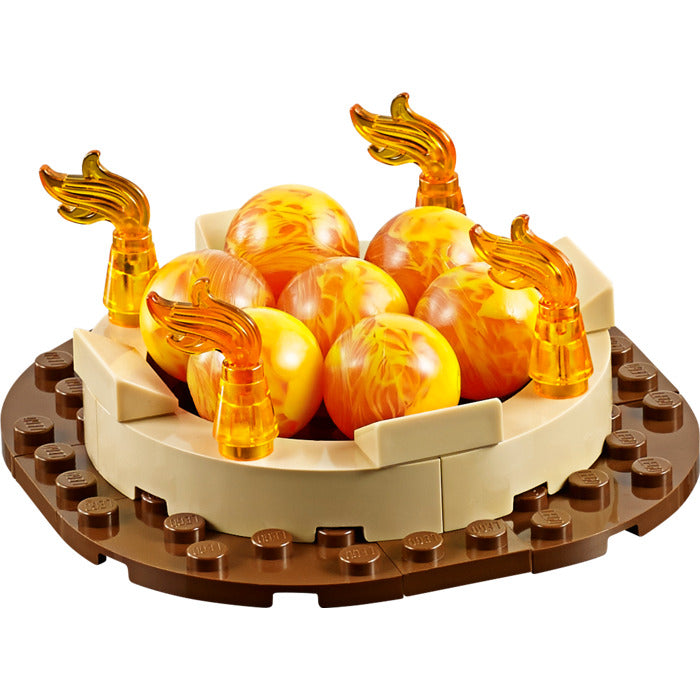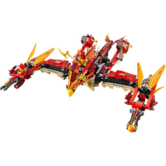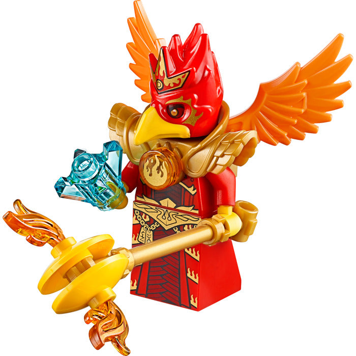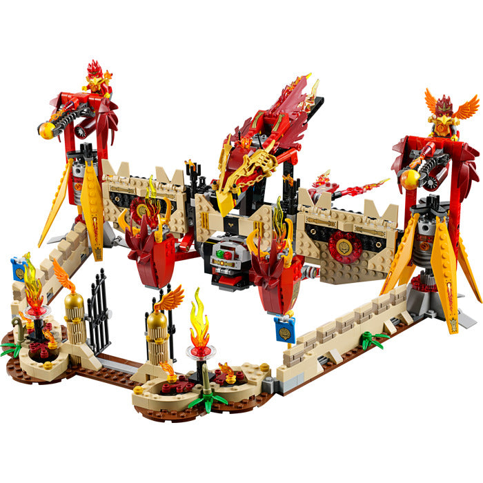 • Phoenix Fire Temple features base opening/closing function, load-and-fire bombing feature, 2 gun turrets with gun sight and seats for minifigures, opening gate, pool of fire balls and translucent flame elements, plus fire CHI power mode flying Phoenix with fire CHI, ball shooters, load-and-fire bombing feature and phoenix detailing
