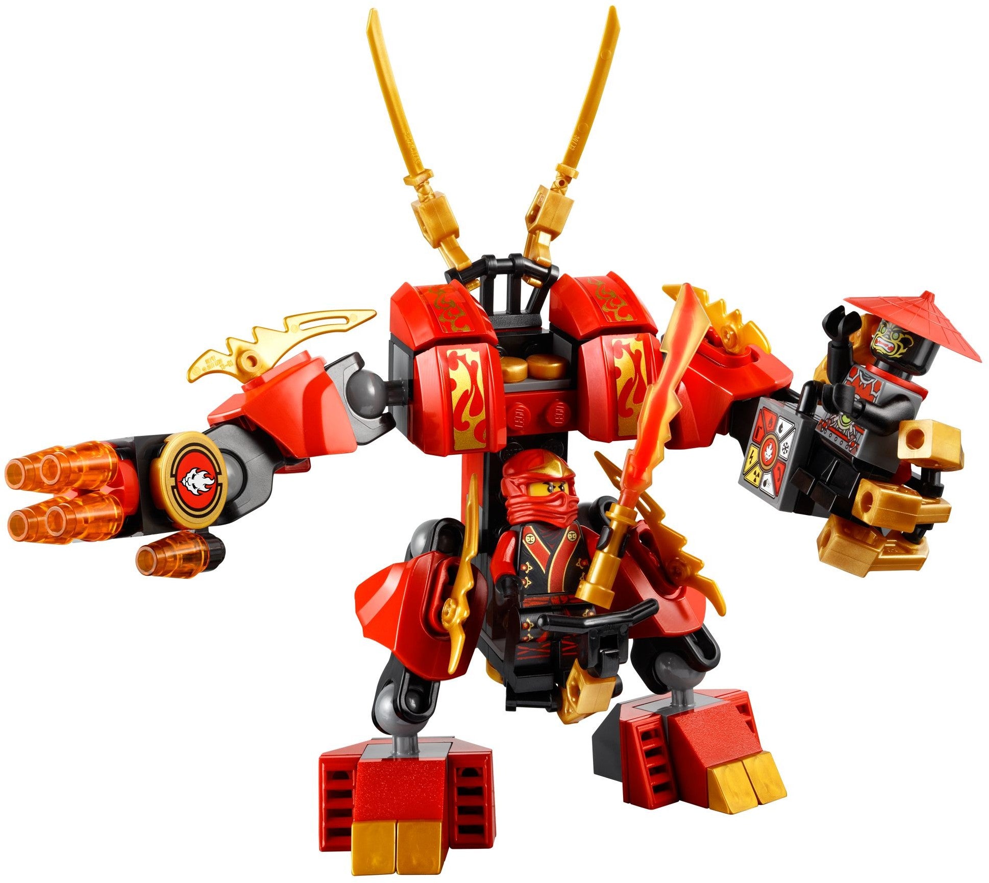 Help the ninjas to collect the 4 elemental blades and awaken the mythical golden mech! Lord Garmadon has sent his scout to snatch the elemental blade of fire from Kai but Kai is ready and waiting in his mighty Fire Mech! The scout's crossbow weapon is no match for the mech's huge double-edged fire blade and impenetrable armor. Battle for control of the elemental fire sword! Includes 2 minifigures with weapons: Kai and scout.