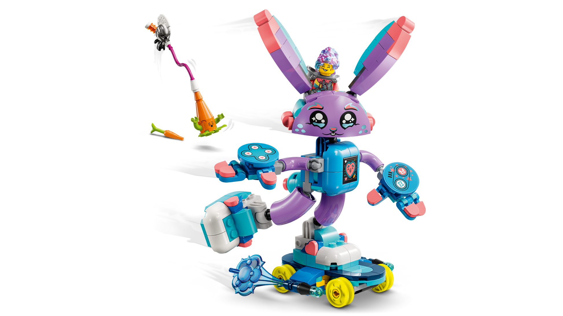 Young dreamers will have fun building the Bunchurro figure, a cool new version of Bunchu the Bunny that has a video game screen on its belly and wears gaming controller gloves and sneakers, before discovering 2 ways to transform it. They can accessorize the rabbit model with a skateboard and boosters or an awesome jetpack. The toy rabbit is highly posable in all modes, and the action is brought to life by an Izzie minifigure, who attaches to the back of Bunchurro to encourage imaginative role play.