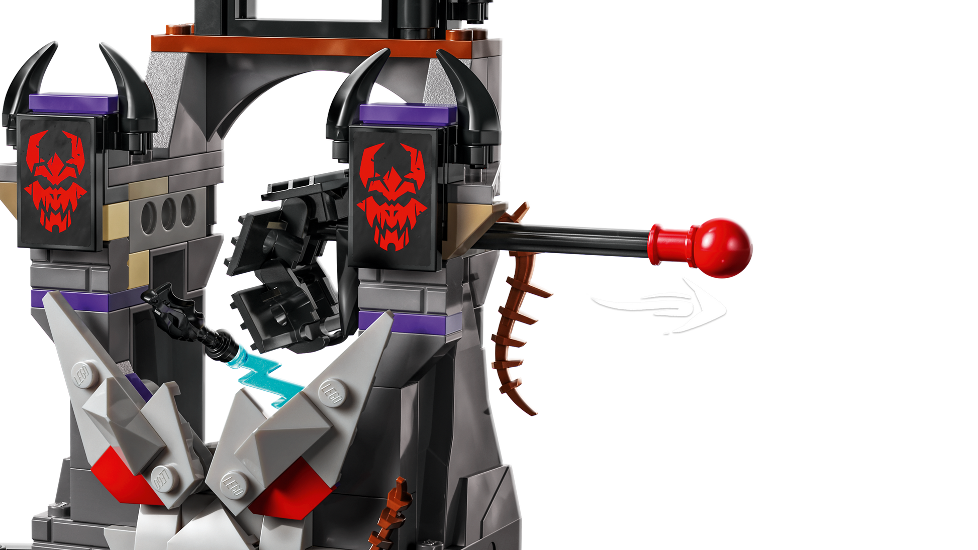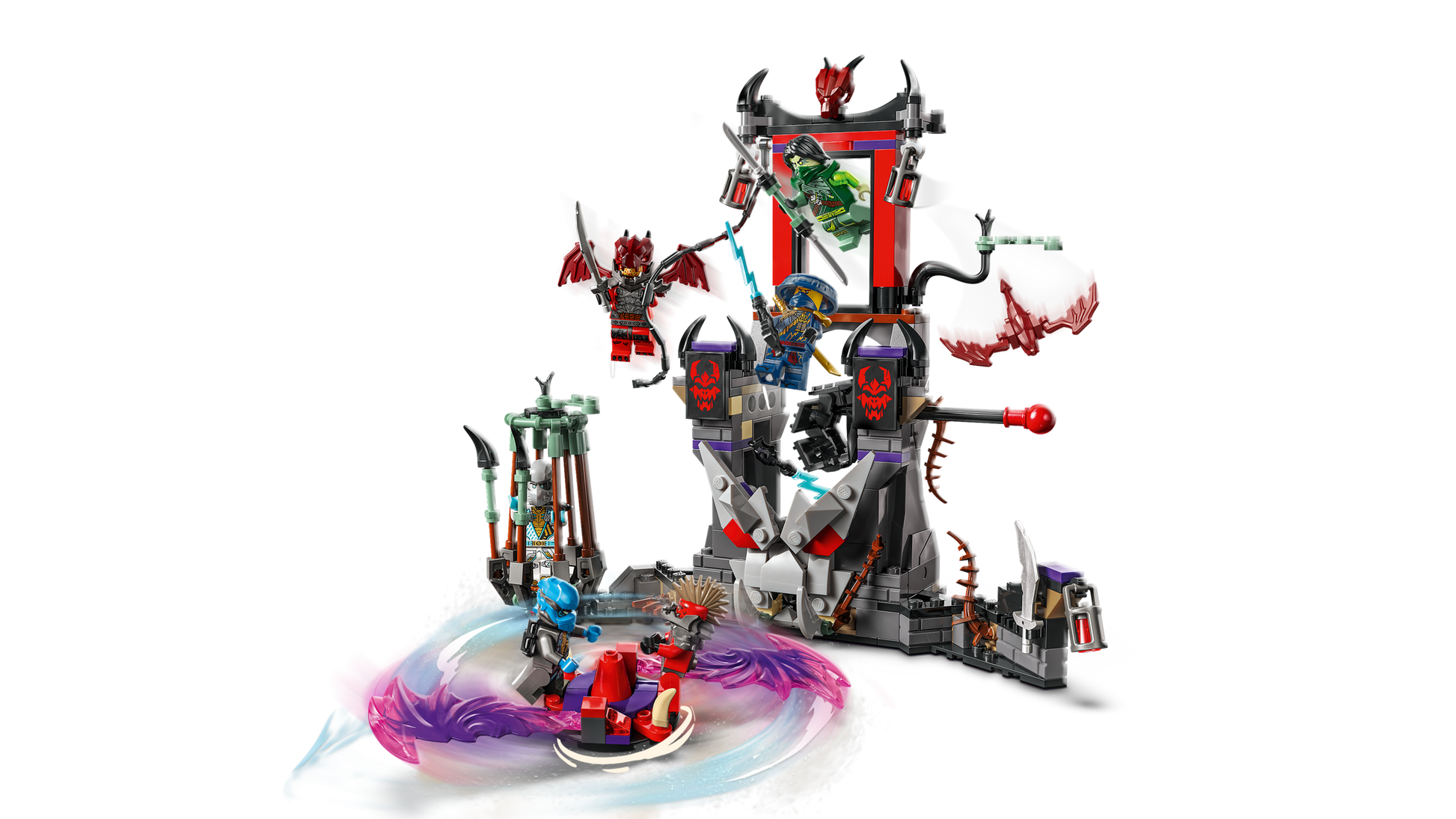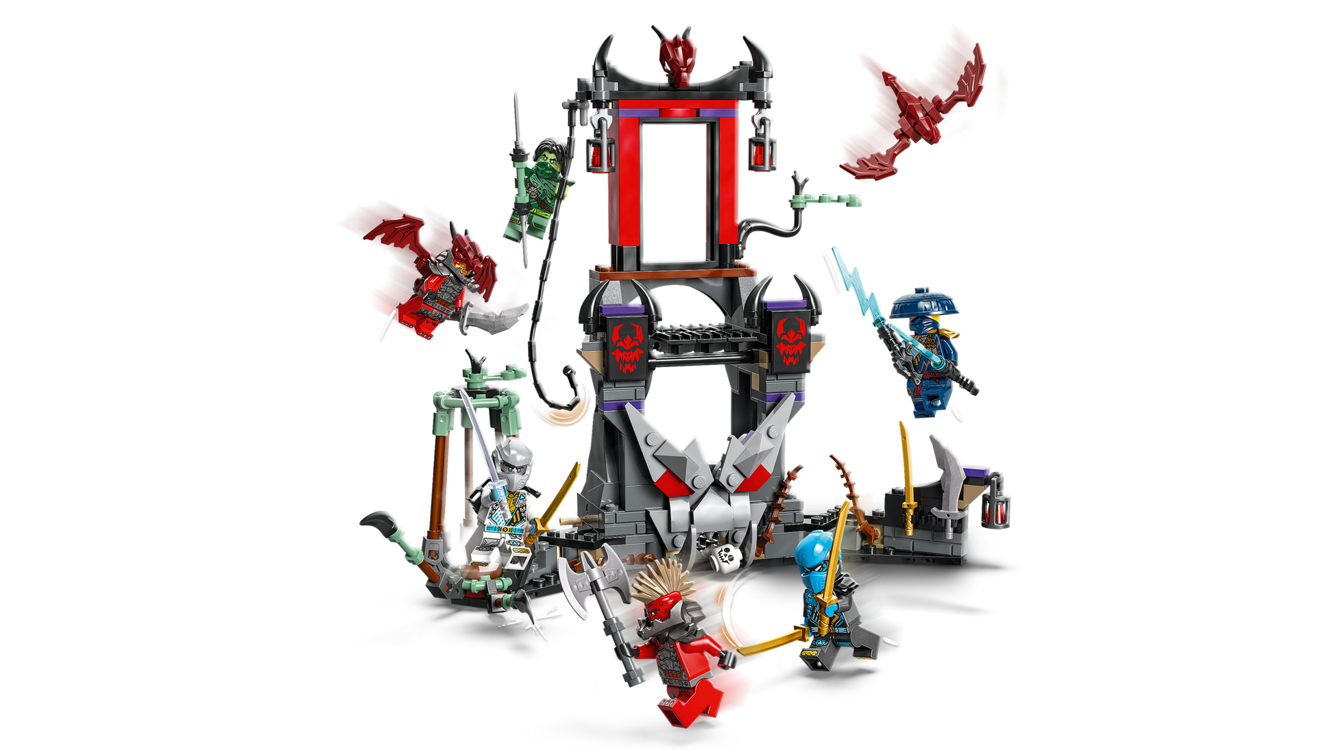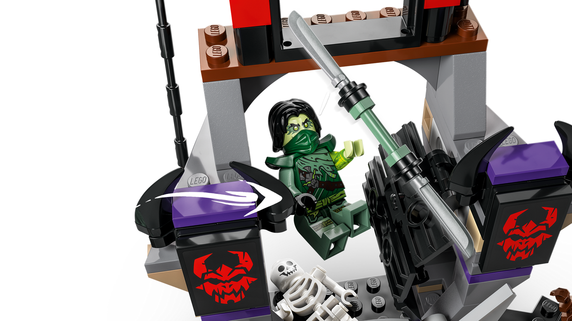- Interactive ninja toy – Includes a cage to detain ninja characters, a retractable bridge and a pit with a skeleton for the ninja to fall into