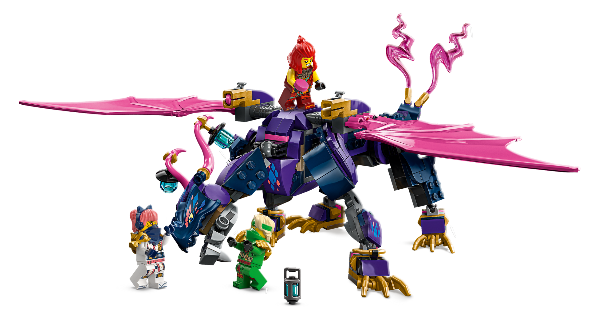 LEGO® NINJAGO® Rontu the Master Dragon (71842) toy lets ninja fans aged 7 and up recreate action-packed scenes from season 3 of the NINJAGO Dragons Rising TV show. This building set for kids features a dragon toy with a posable tail, legs, wings, head and jaw, 2 positions to place a minifigure on its back and a stud shooter under each wing.