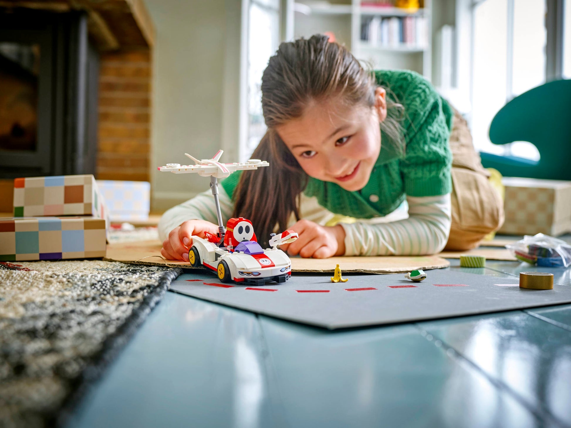 - LEGO® Super Mario™: Mario Kart™ toy building set for kids – Team up with the Shy Guy in his brick-built P-wing for driving, drifting, gliding and shell-launching action