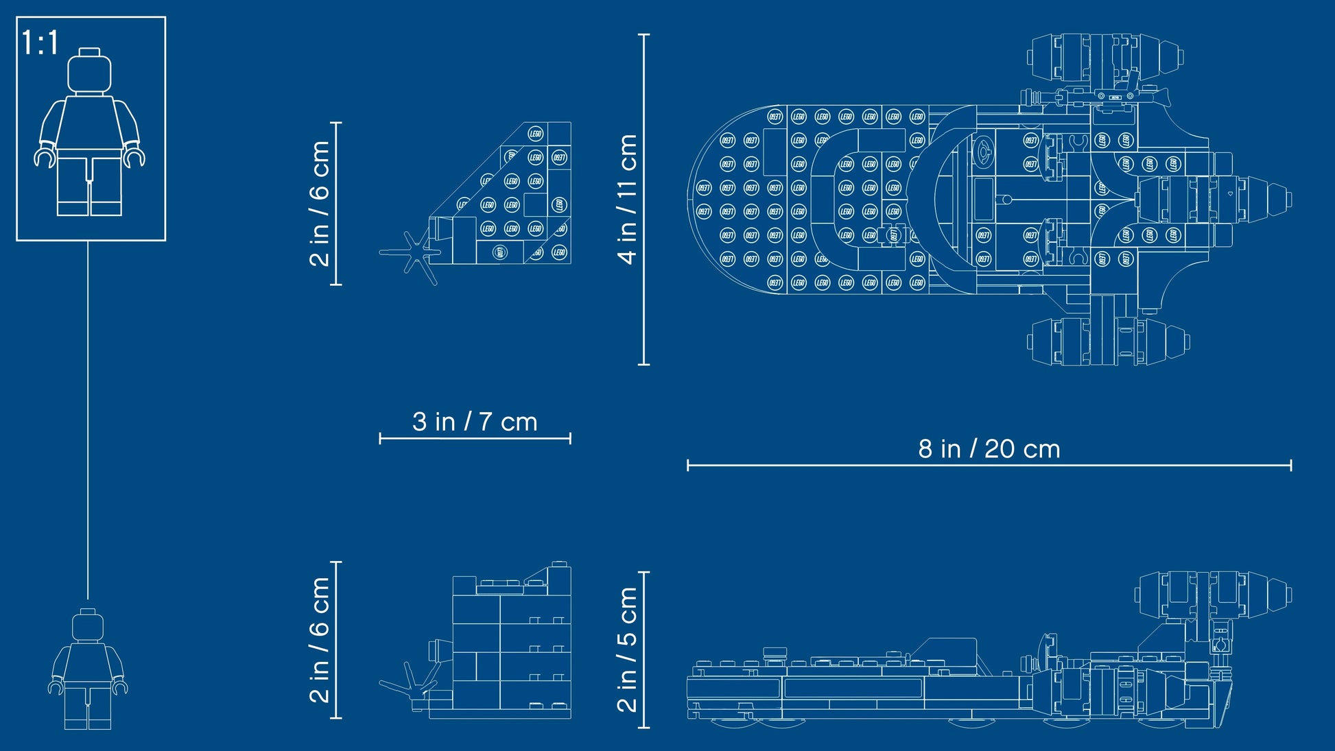 - Luke's landspeeder measures over 1” (5cm) high, 7” (20cm) long and 4” (11cm) wide – small enough to pop into a bag with the cave build and Star Wars™ minifigures, ready for play wherever kids go!