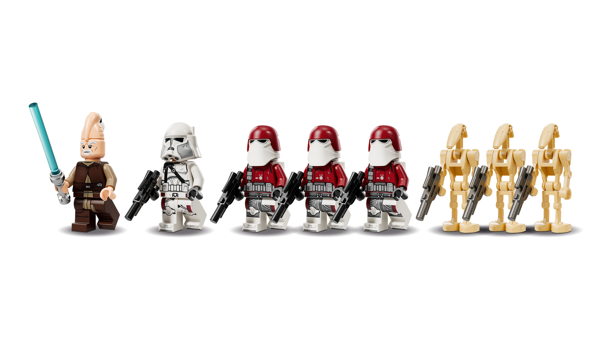 - 5 LEGO® Star Wars™ minifigures – Ki-Adi-Mundi with a Lightsaber™, Commander Bacara with a blaster and 3 Galactic Marines with blasters, plus 3 Battle Droid LEGO figures with blasters for battle play