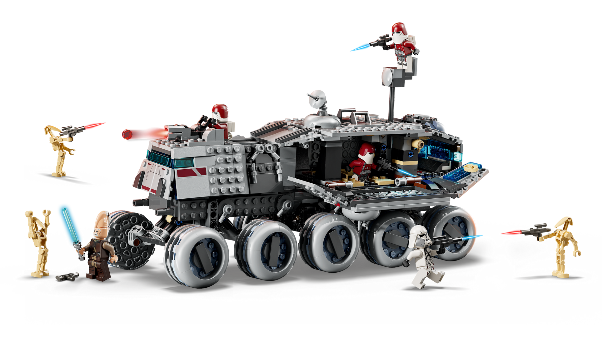 The set includes 5 LEGO Star Wars minifigures: Ki-Adi-Mundi with a Lightsaber™, and Commander Bacara and 3 Galactic Marines, each with blasters, plus 3 Battle Droid LEGO figures with blasters. Place the LEGO minifigures in the front and rear cockpits, the main compartment (which has seating and weapon racks), on the elevating observation post and in the rear turret with a stud shooter.