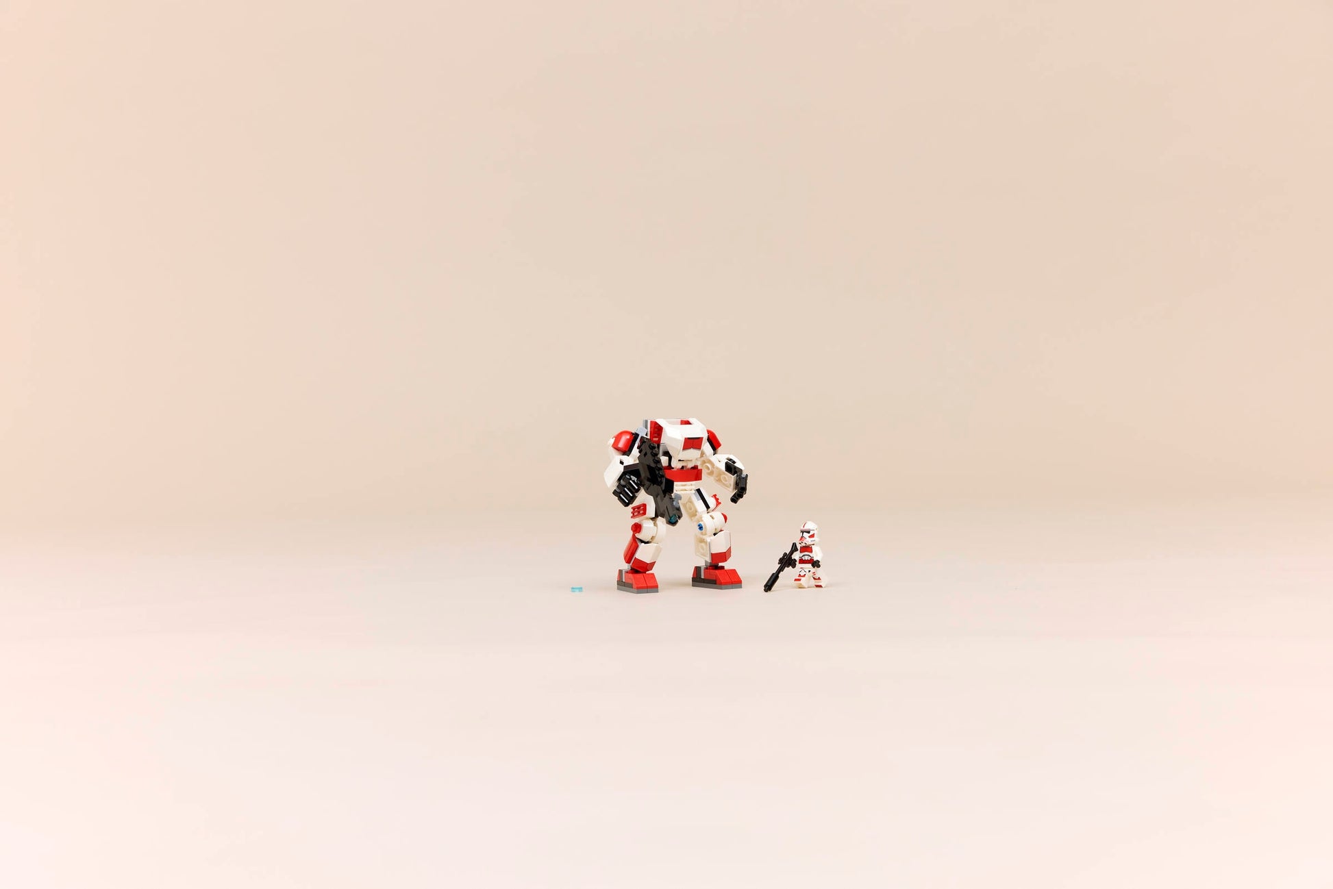 Put the Clone Shock Trooper LEGO minifigure in the mech’s cockpit and clip its blaster rifle to the back of the mech. Adjust the mechs arms, legs and feet to create battle poses. Place the large blaster rifle in its gripping hands and activate its stud shooter. With its armor in the distinctive red and white colors of Clone Shock Troopers, the mech also looks cool displayed in kids’ bedrooms between playtime missions.