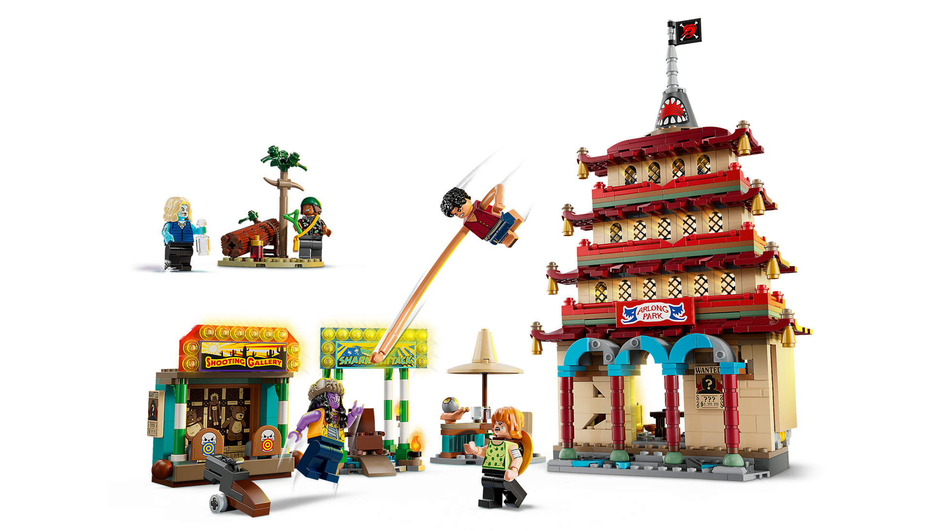 The building set comes with minifigures of Luffy – who comes with arm-lengthening pieces – Nami, Usopp, Arlong and Chu. Kids can collapse the pagoda model during battle by tapping it firmly on top, and the shooting gallery has fun targets for kids to aim at with stud-shooters. Villainous Arlong can be placed on a throne inside the shark attack building. Chu can get a drink at the shack, and the forest contains an iconic ketchup bottle. This playset also contains stud-shooters and accessories, including 3 'Wanted' posters. For added digital fun, builders can zoom in, rotate models in 3D and track their progress using the intuitive LEGO Builder app. Set contains 926 pieces.