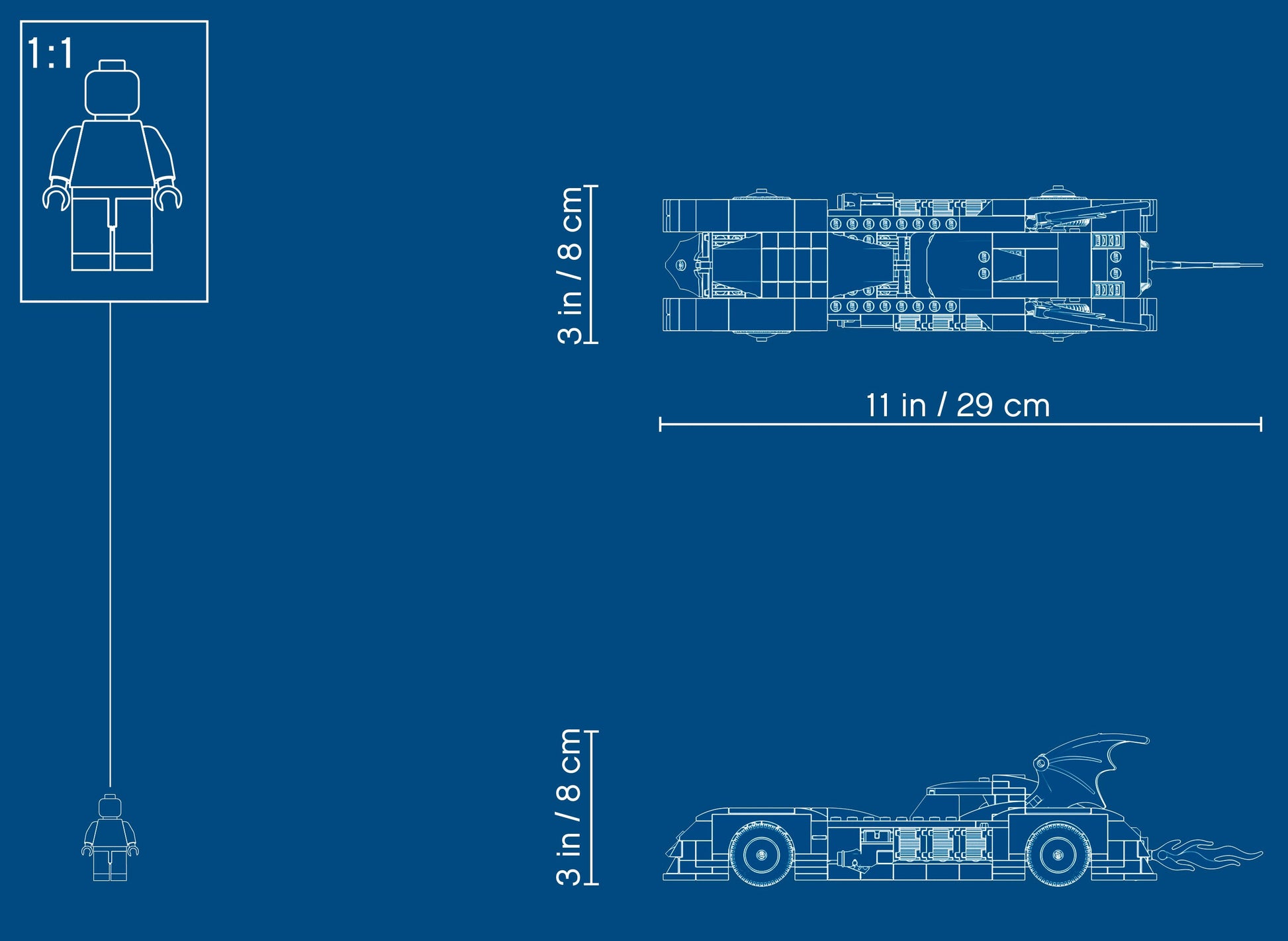 - Batmobile™ toy car measures over 2” (7cm) high, 9” (24cm) long and 2” (6cm) wide.