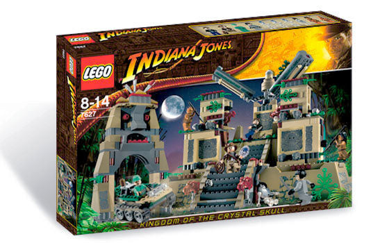 What is the secret of the Temple of the Crystal Skull? Indiana Jones and Mutt want to find out, but first they'll have to get past Irina Spalko, and then survive the temple's collapsing stairs, firing spears, hostile warriors, and many other tricks and traps. Includes Indiana Jones, Mutt Williams, Irina Spalko, Russian Guard, 2 Ughs Warriors, armored skeleton and 3 Akator Skeleton minifigures! Temple features moving staircases, hidden rooms, flying objects and lots of cool details! Temple stands 10" (25cm) high! Base measures 15" x 10"!