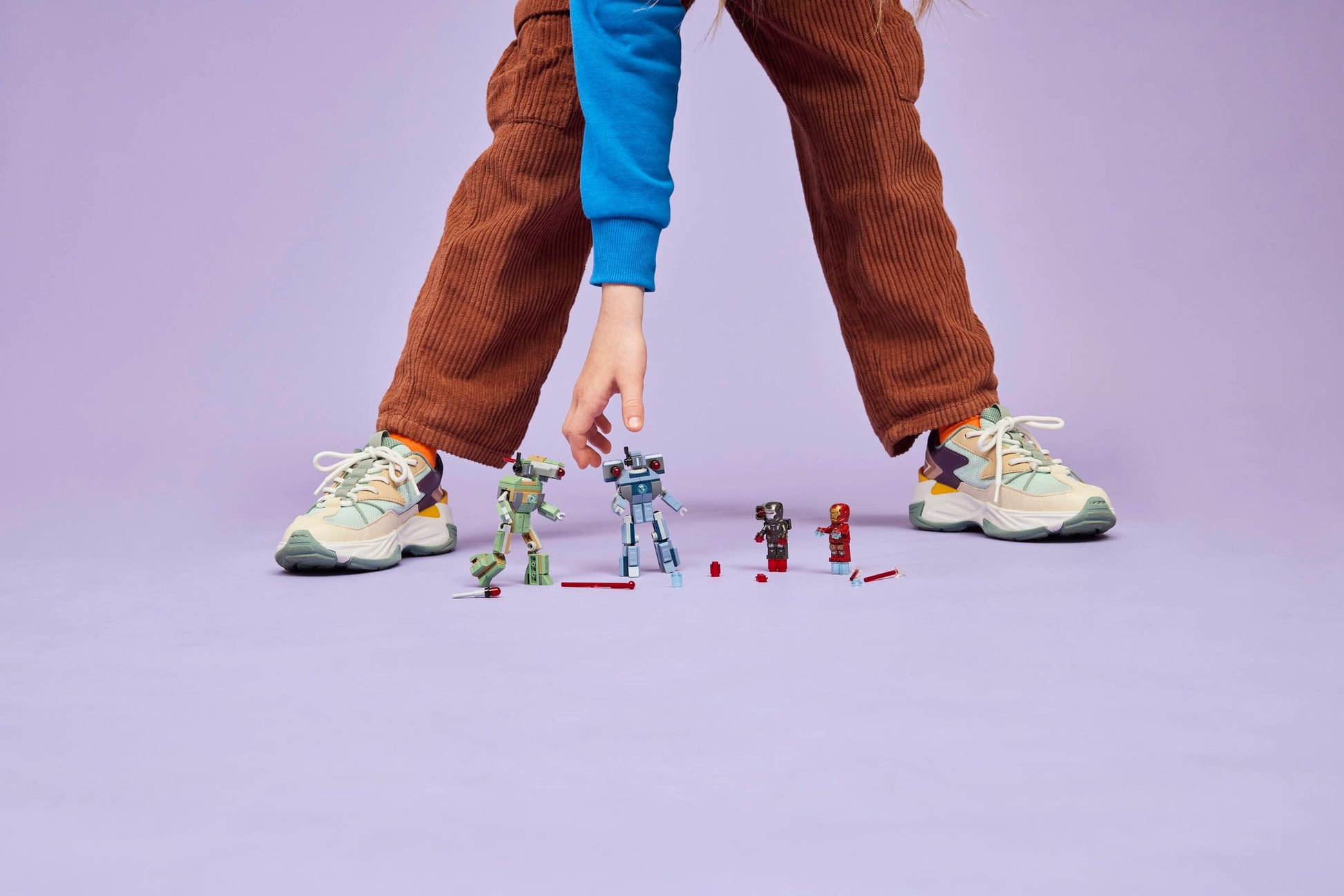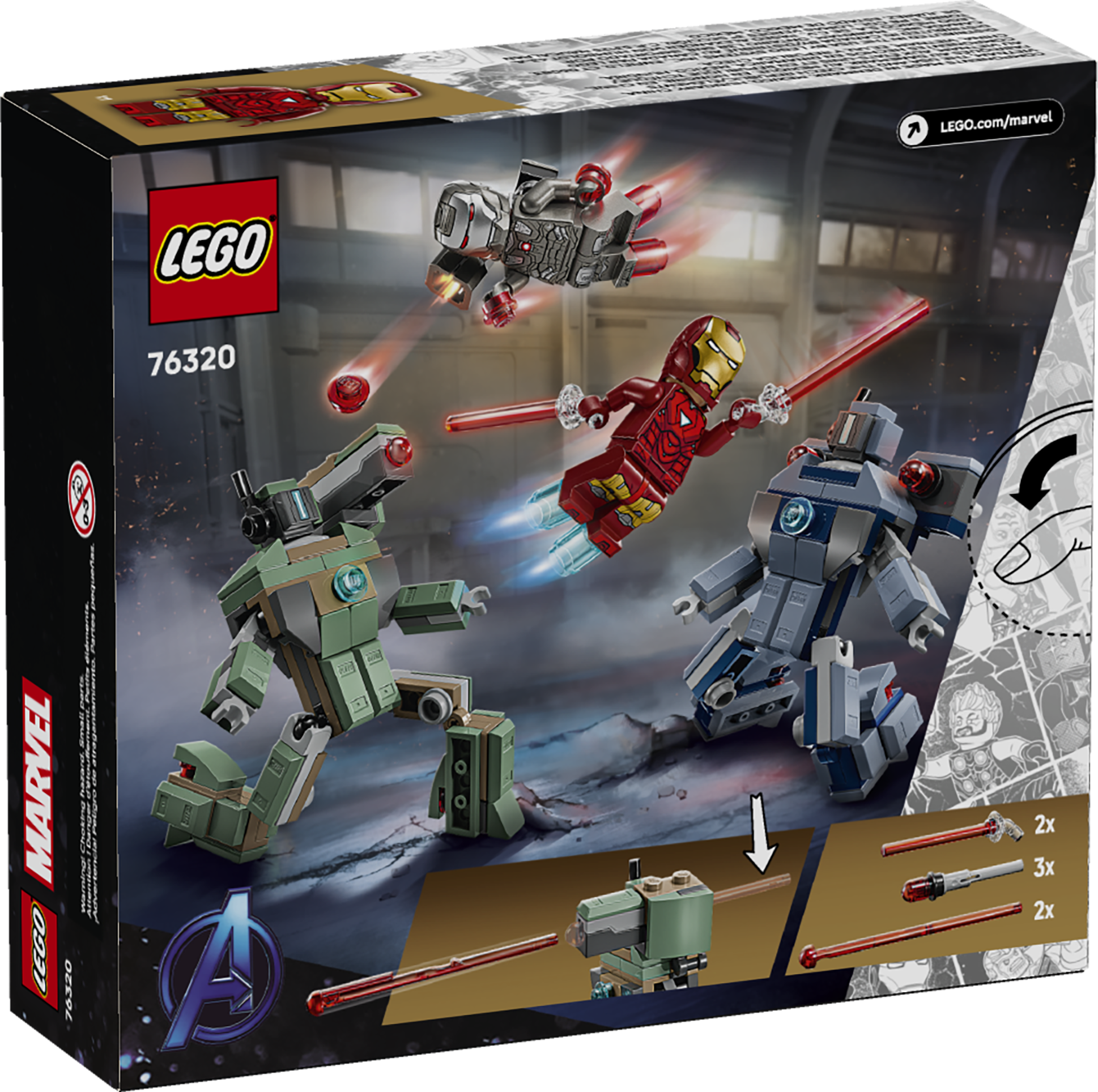 - LEGO® | Marvel minifigures – Includes an Iron Man minifigure with blue hand and feet blasters and laser beam weapons and a War Machine minifigure with red hand and feet blasters and a stud shooter