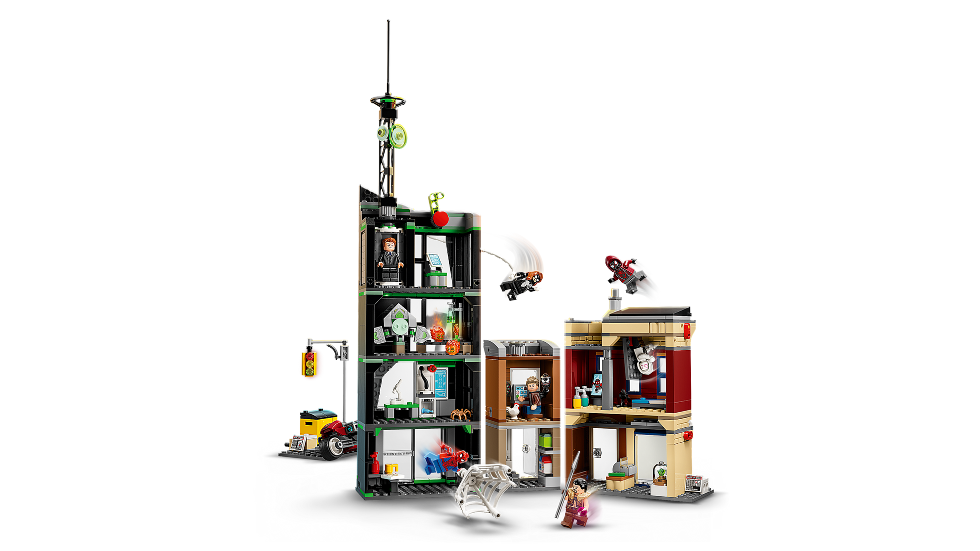 The street scene comprises 3 separate buildings: Miles Morales’s apartment with a jewellery shop underneath, the Oscorp building, and Venom’s apartment with a newsagent below. Each room is furnished with relevant equipment and accessories. 8 LEGO minifigures from the Marvel films ensure endless web-slinging action: Spider-Man, Spider-Woman, Miles Morales with his motorbike, Eddie Brock, Ghost-Spider, Norman Osborn, Kraven the Hunter and Green Goblin with his glider. Transparent sticks allow kids to position and pose characters with realistic ease. Build Together on the LEGO Builder app lets friends and family share the creative fun. Contains 808 pieces.