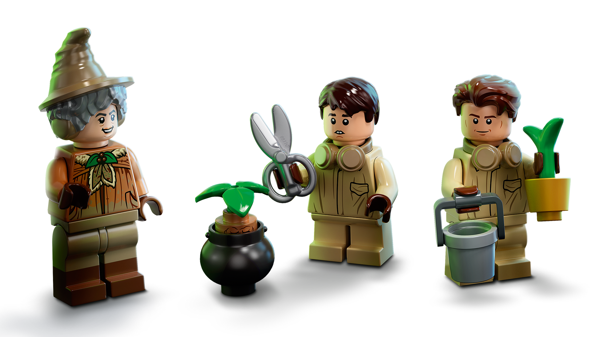 - Includes Cedric Diggory, Neville Longbottom™ and Professor Sprout minifigures, a spell book, pumpkin patch, watering station with bucket and golden faucet, and a greenhouse backdrop.