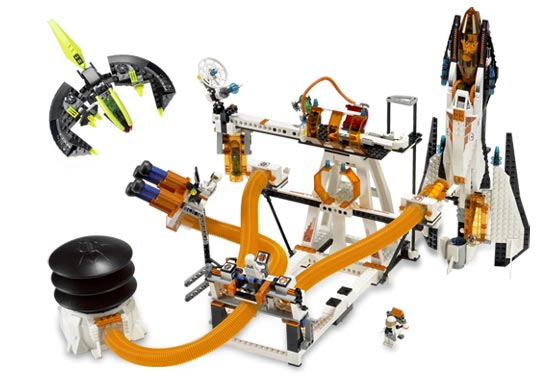 Aliens are attacking the MB-01 Eagle Command Base on Mars! Fight back with air-powered missiles, then turn the air pump to transfer captured aliens and energy crystals through the base's tubes. Launch the high-tech shuttle to battle the alien ship! Complete base set includes alien transport pods, alien attack ship, futuristic space shuttle and air pump system! Includes 4 foam missiles that are safe for play! Includes 4 astronaut minifigures and 4 glow-in-the-dark alien minifigures! Space shuttle stands 15" (38cm) high! Examine captured aliens on the command base!
