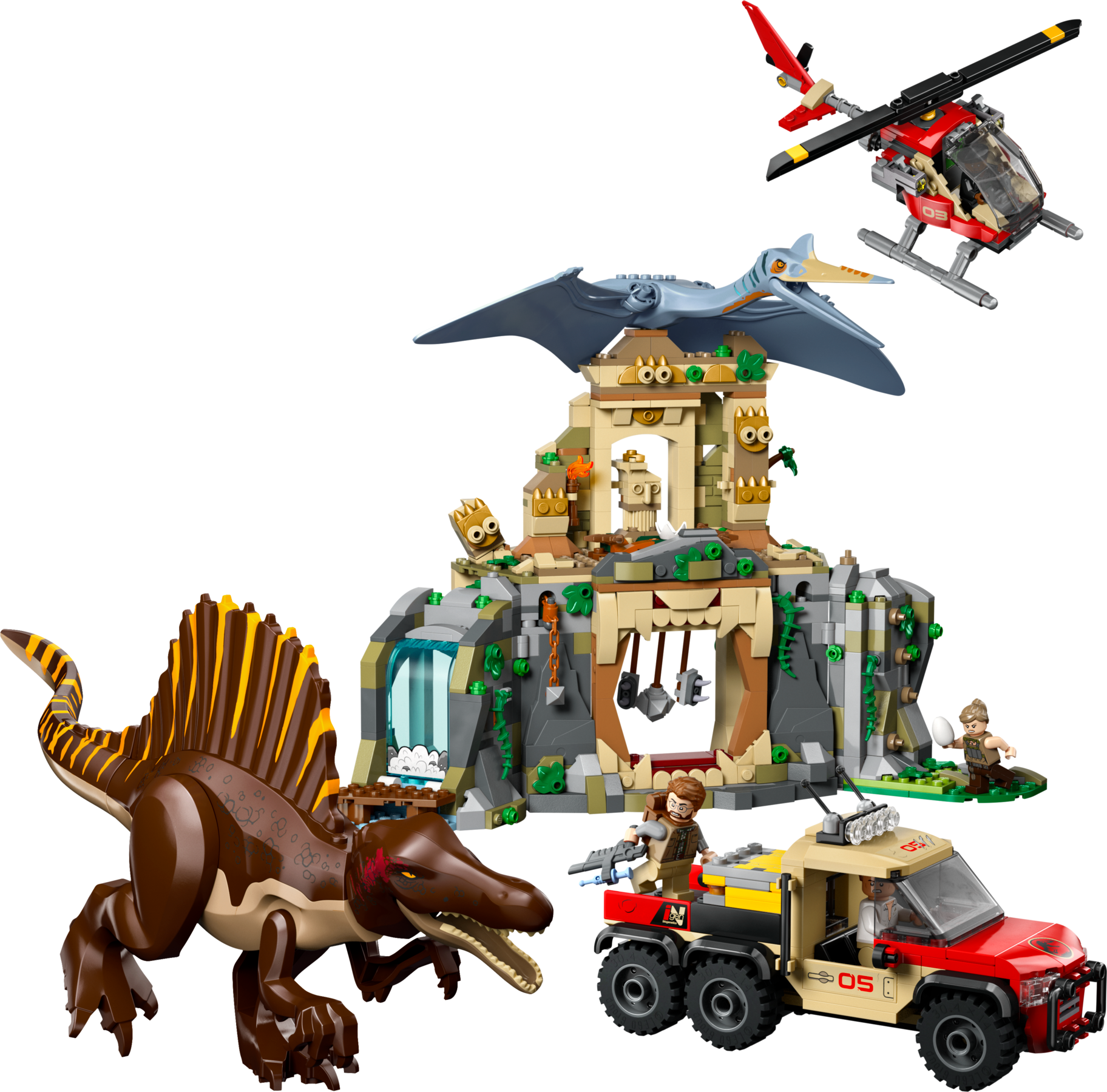 - Jurassic World Rebirth toys in a LEGO® box – Molded Spinosaurus and Quetzalcoatlus figures, 4 movie character minifigures, an ancient temple, a toy helicopter and dinosaur truck toy, plus lots of details