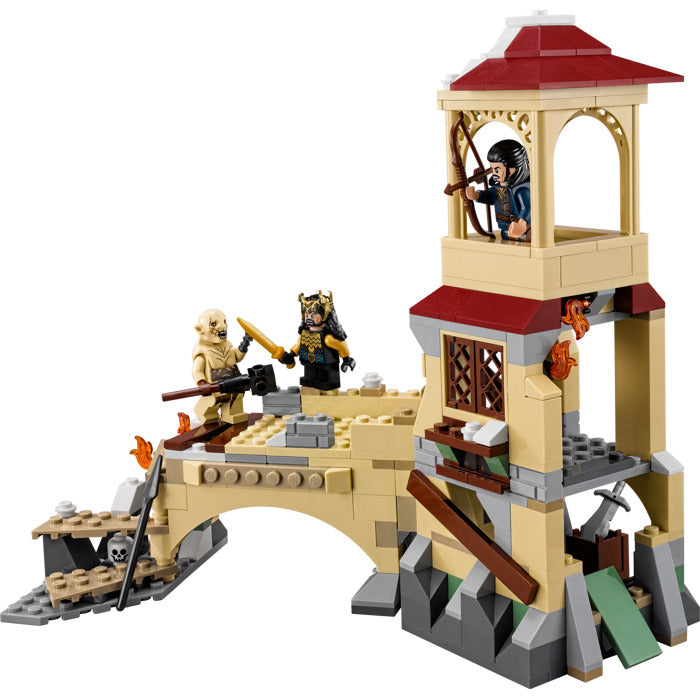 The scene is set for an epic battle at the ruins of Dale as the Elves, Dwarves and Men unite to take on the fearsome Orc army. Keep watch for advancing Orcs from the look-out tower. Let battle rage between good and evil as the Orcs shoot giant arrows from the crossbow of their massive mobile battle machine. Activate the explode functions to bring the bridge crashing down and make one side of the tower collapse. With the evil Orcs threatening to emerge victorious, will Gwaihir™, the leader of the Giant Eagles, arrive in time to assist our heroes? Includes 7 minifigures with assorted weapons and accessories: Thorin Oakenshield™, Dain Ironfoot, Legolas Greenleaf™, Azog™, Bard the Bowman™ and 2 Gundabad Orcs, plus a Gwaihir figure.