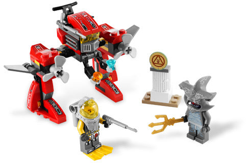 Walking through the ruins of the lost city of Atlantis on his powerful Seabed Strider, valiant diver Axel Storm discovers the precious golden shield. He transforms his craft into a sleek submarine to return the treasure to the surface, but can he first defeat the trident-carrying Hammerhead Guardian?