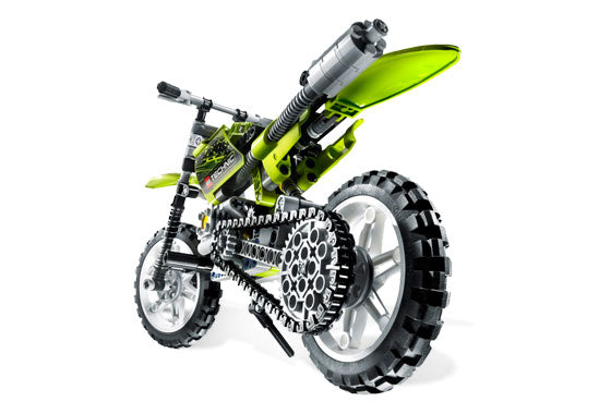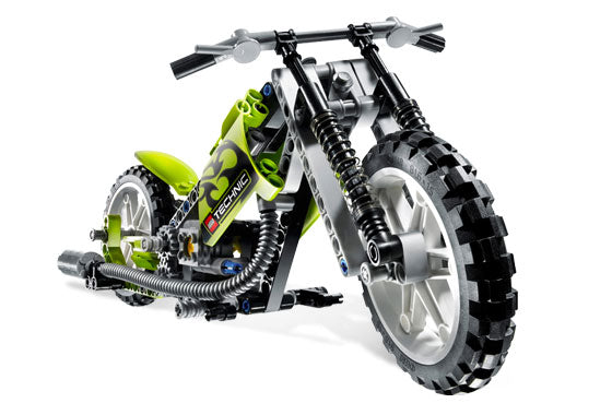 Rev up your ultimate dirt bike with a working drive chain that powers the V2 engine, then challenge any off-road terrain with front and rear suspension and a working kickstand. For total functional realism, it's LEGO TECHNIC all the way! Includes instructions to rebuild into a Chopper! Dirt Bike has front and rear suspension, a working kick stand, chain and gear that really move, working 2-piston engine and front-wheel steering! Measures over 11" (28cm) long and 6" (15cm) tall!